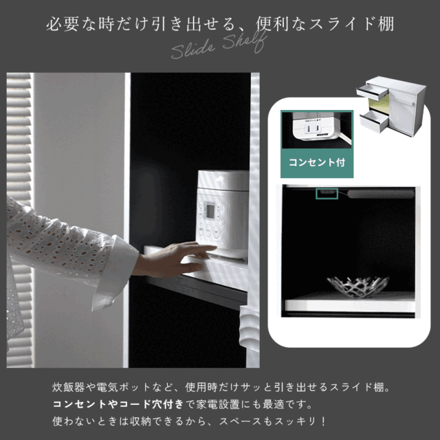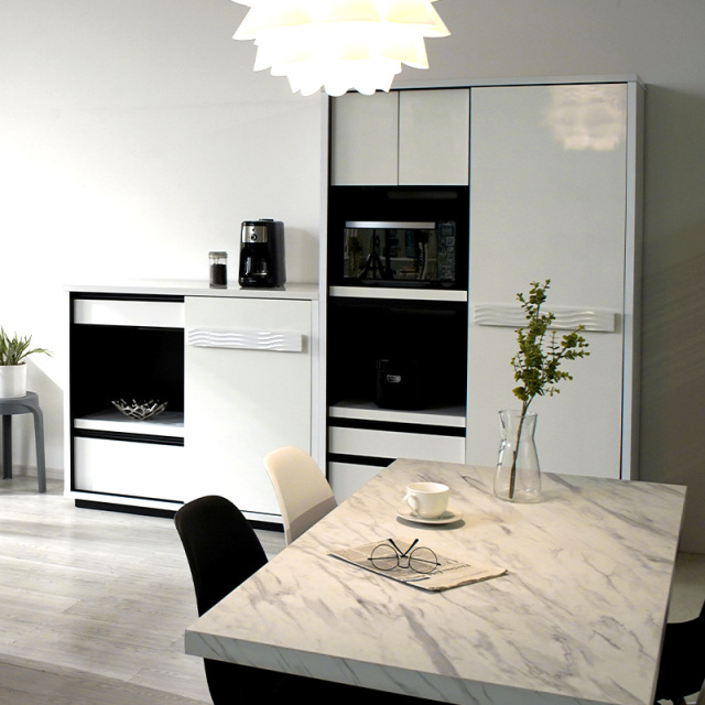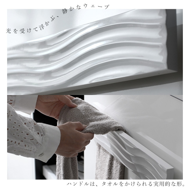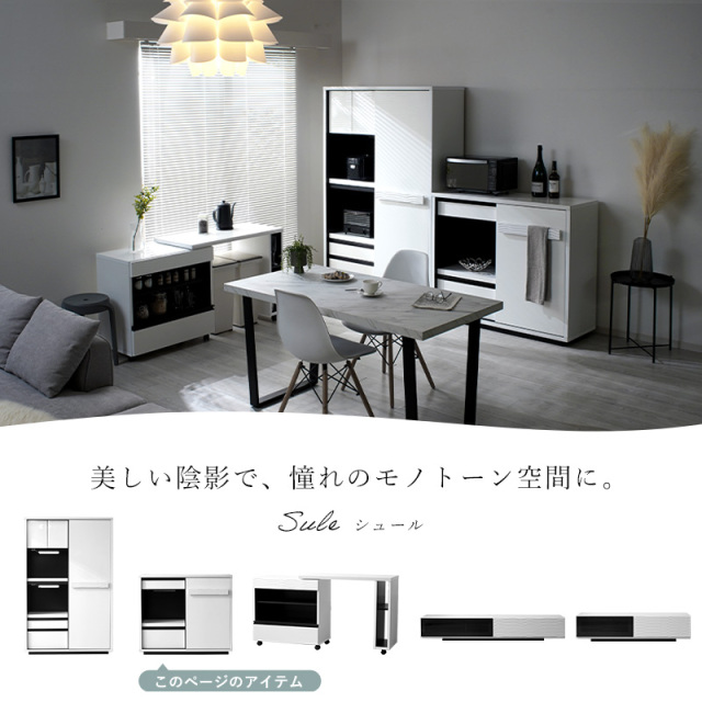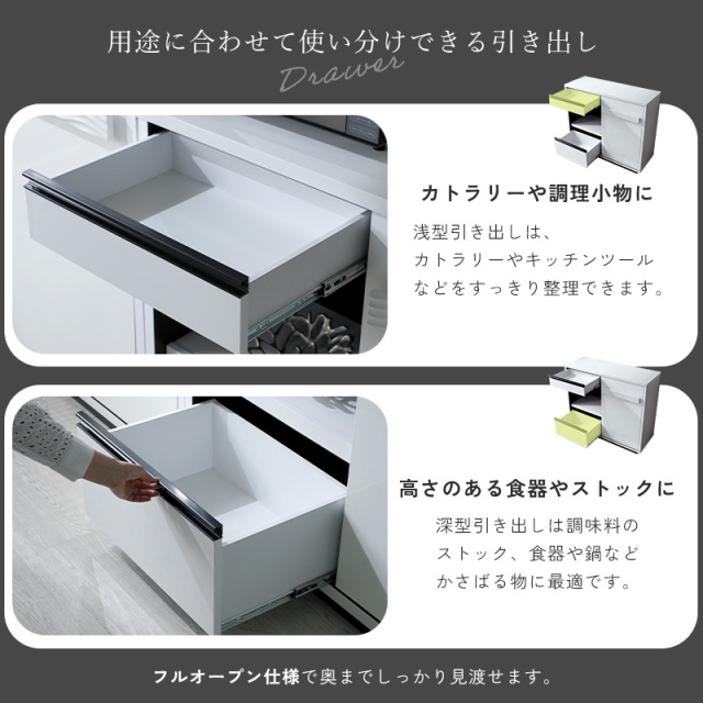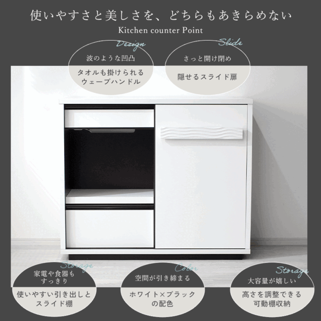 | 美しい陰影で、憧れのモノトーン空間に。 ハンドルのウェーブデザインは、光を受けて浮かび上がる立体感が魅力。キッチンに洗練された表情を添えます。 幅118cmのキッチンカウンターは、調理台としても収納棚としても使える多機能タイプ。 全体にスライド扉を採用し、使わない時はすっきり隠せるスマートなキッチン収納です。 天板は耐久性のあるポリエステル化粧板仕上げで、作業台としても安心。引き出しやラックを備え、調味料や器具、食器類まで効率よく整理できます。 家電に便利なスライド棚はコンセント付き。炊飯器やポットを快適に使え、使わないときはすっきりと収納可能です。浅型・深型の引き出しはフルスライドレール仕様で奥までしっかり引き出せ、日常使いに快適。 使いやすさと美しさを、どちらもあきらめない。 安心の日本製・大川家具、完成品でお届けするため、届いてすぐにお使いいただけます。 | |