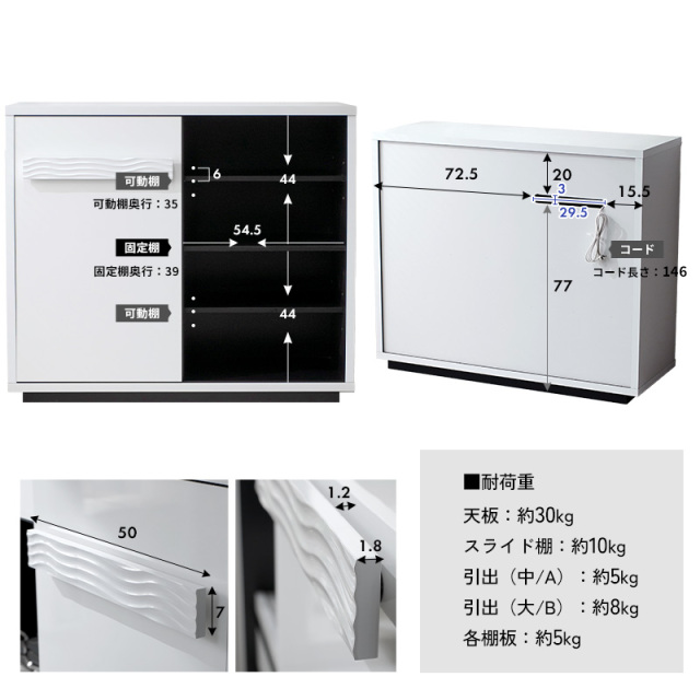 | 耐荷重 | 天板:(約)30kg スライド棚:(約)10kg 引出(大):(約)8kg 引出(中):(約)5kg 各棚板:(約)5kg |
