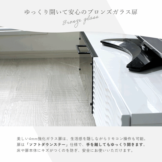 | 美しい陰影で、憧れのモノトーン空間に。 前板のウェーブデザインは光を受けて立体的な表情を生み出し、リビングに上質な存在感を与えます。 幅120cm・170cmの2サイズ展開で、32V~60Vの大型テレビにも対応。4mm強化ブロンズガラス扉はリモコンの赤外線を通すため、扉を閉めたままでも機器の操作が可能です。さらにソフトダウンステー仕様で、扉はゆっくり静かに開閉。床や扉に衝撃を与えず安心してお使いいただけます。 引き出しはフルスライドレール仕様で奥までしっかり引き出せ、DVDや雑誌、小物の収納に便利。仕切りは取り外しや位置調整が可能で、整理整頓もしやすい設計です。背面や天板にはコード穴を設け、配線をすっきりまとめられるのもポイント。 使いやすさと美しさを、どちらもあきらめない。 安心の日本製・大川家具、完成品でお届けするため、届いてすぐに快適なリビング空間を実現します。 | |