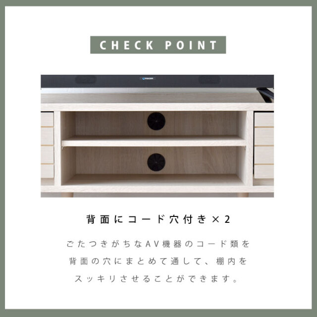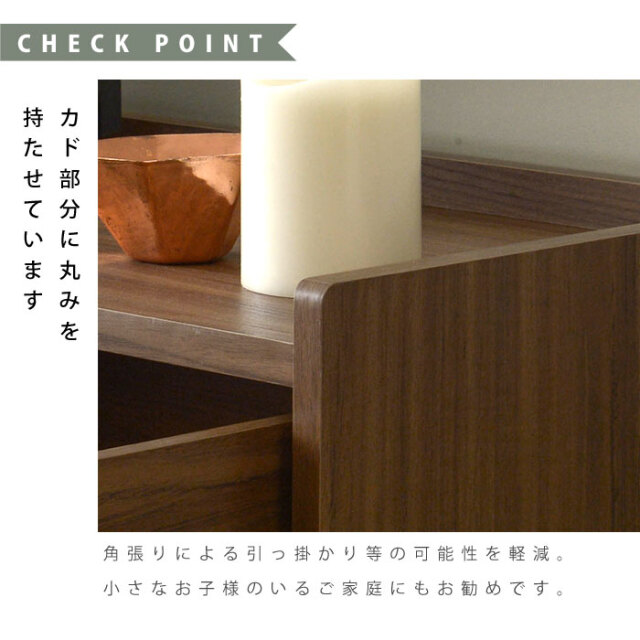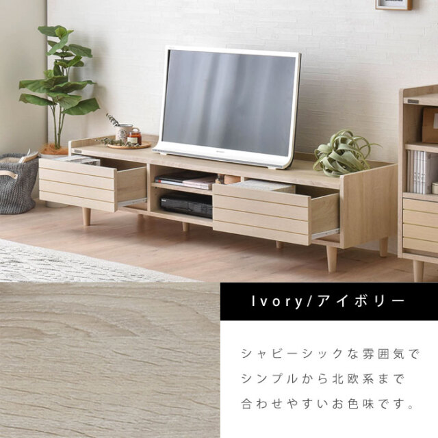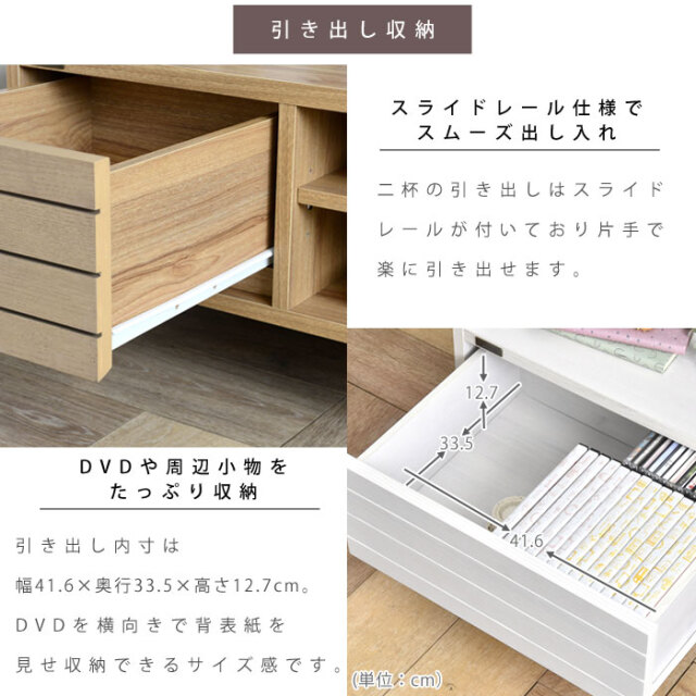 | 充分な収納力と美しい木目模様が魅力のローボード。 上質な雰囲気を引き出す木目模様が特徴の TWICEシリーズのテレビ台ローボードです。 あなたのお部屋の雰囲気に合わせて選べる4カラーの豊富な色展開で、モダン・アンティークから人気の北欧テイストのお部屋までコーディネート。 本体はリアルな木目柄の化粧繊維板を使用し、引き出し前板は天然木の突板加工を施し、ナチュラルな風合いと高級感を演出します。 もちろん見た目だけではなく、オープン棚と引き出しによる抜群の収納力も。 オープン棚は付属のダボで三段階に高さを調節可能。引き出しは幅41.6×奥行33.5×高さ12.7cmで、DVDを横向きで背表紙を見せて収納できます。 また、引き出しはスライドレールが付いていますので、たっぷり収納してもスムーズに出し入れが可能。 背面にはコード穴付きで、ごたつきがちなコード類を纏めて通し、スッキリさせることができます。 物が落ちにくいデザインで、カド部分には丸みを持たせているので角張りによる引っ掛かりの可能性を軽減する仕様。 斜めカットの引き手や先細りテーパード仕上げの脚部が美しいフォルムで、シンプルながらも細部までこだわったつくりとなっています。 | |