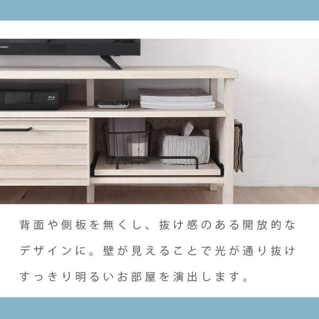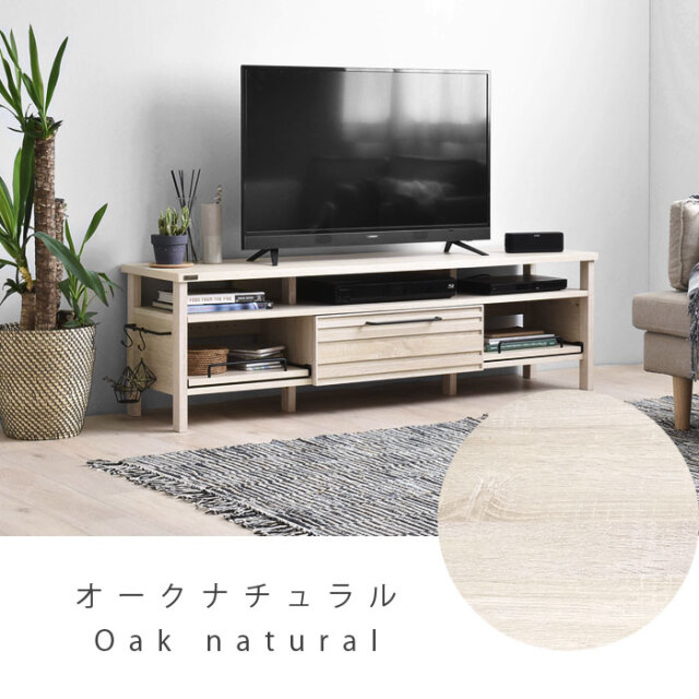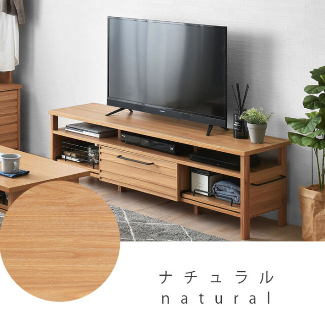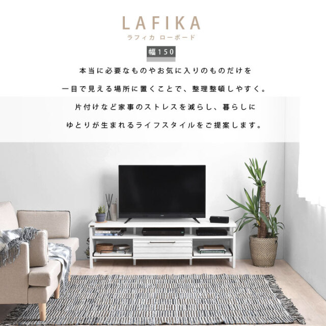 | まるで天然木のような木目調、”あったら嬉しい”が叶う収納力 【 LAFIKA ラフィカ ローボード テレビ台 幅150cm 】 表面材はリアルな天然木を緻密に再現した木目調が美しい。 スライド棚部分は合成樹脂加工を施しているので水やキズに強いのも嬉しいポイントです。 リビングをすっきり見せるこだわりの収納力。 幅150cmの天板は、耐荷重が約50kgありますので、おおよそ65型テレビまで対応が可能です。コードスリットもついており、壁にぴったりつけられるのも嬉しいポイント。 大容量の引き出しにはDVDやCDなどテレビ周りの雑多なアイテムも、タイトルが読める状態ですっきりまとめて管理可能です。 オープン収納でありながら引き出して使うことができるスライド棚もついており、奥の物も取り出しやすい。リモコンや雑誌など、まとめてさっと収納できます。 サイドバーにはアロマスプレーやクロスなどをさっと掛けてしまえるので、物の場所を定位置に決めることができ、すっきり美しいお部屋を保つことができます。 高さは約45cmで、ソファに座っても、床に座っても見やすいちょうどいいサイズ感なのも使いやすいポイントです。 テレビ台としてだけではなく、インテリアを置いてサイドボードにしたり、コスメ台やデスクとして等、幅広い用途にご使用いただけます。 お部屋の雰囲気にあわせて選べる3カラーで、さらにお洒落な空間を演出します。 LAFIKAシリーズで揃えても雰囲気が高まっておすすめです。 | |