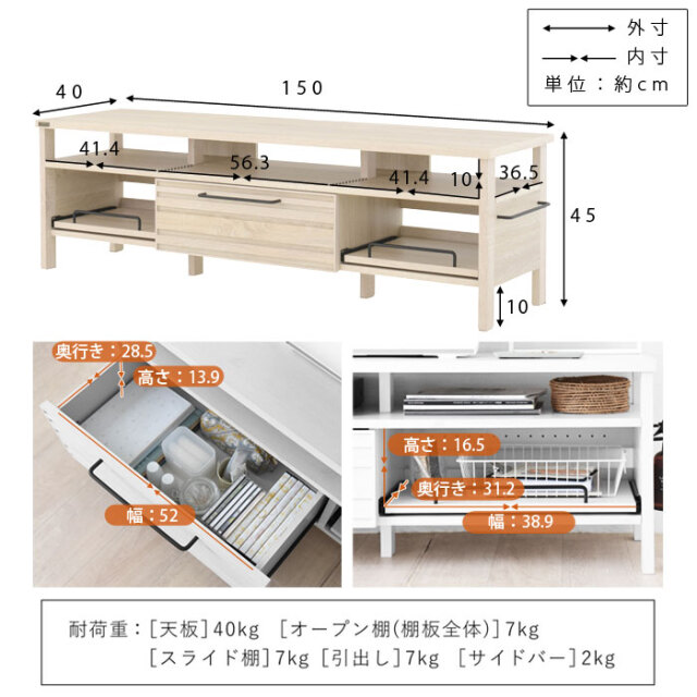 | 商品サイズ | (約)幅150cm×奥行き40cm×高さ45cm |