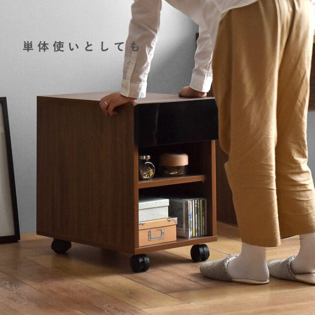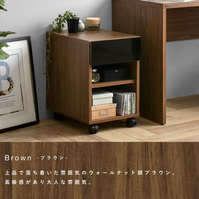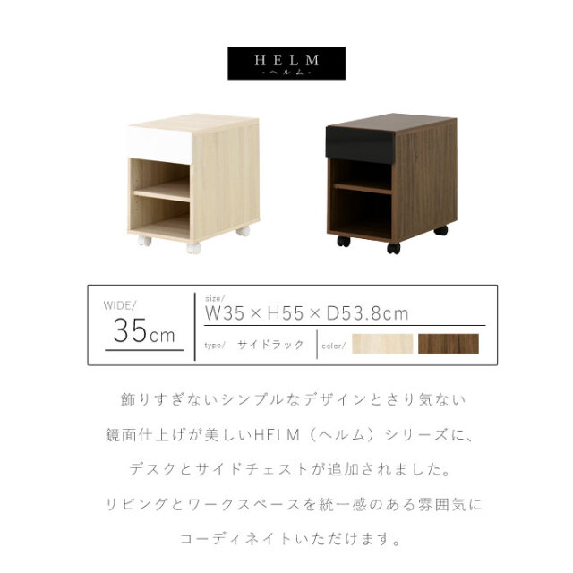 | 自分らしいスタイルで毎日の作業を快適にサポート 木目調 サイドラック 幅35cm HELM 飾りすぎないシンプルなデザインとさり気ない鏡面仕上げが美しいHELM(ヘルム)シリーズに、デスクとサイドチェストが追加されました。 リビングとワークスペースを統一感のある雰囲気にコーディネイトいただけます。 自分らしいワークスペースづくりに魅せる・収納力・使い勝手を追及した HELMシリーズ デスク2サイズ、サイドチェスト、サイドラックをご用意しました。 単品でもセットでも組み合わせは自由自在。 お部屋に合わせてお使いいただけます。 自宅での仕事や趣味の作業などのスペースをすっきり美しく見せる、隠れた機能が付いています。 1段目は浅めの引き出しは書類や文房具などを整理するのにぴったり。 3段目はオープン収納部は、奥行きがたっぷりあり、長さのあるものも収納できます。 天板の表面は傷が付きにくく水に強いPVCコーティングを施しています。 | |