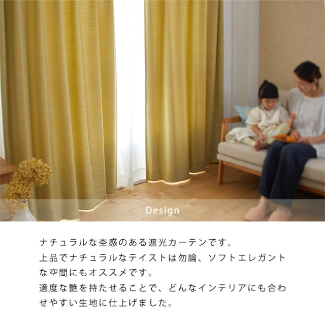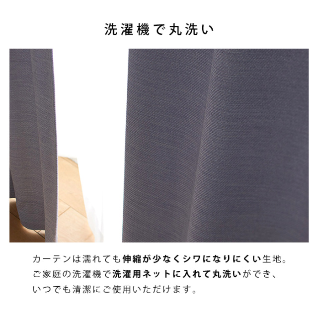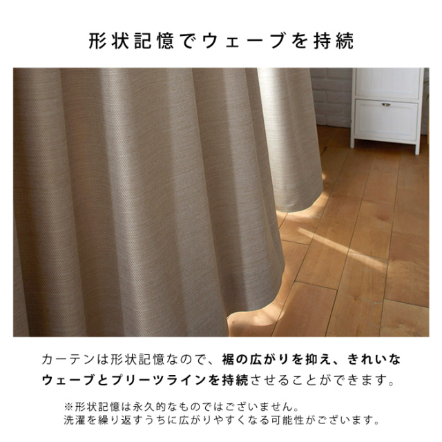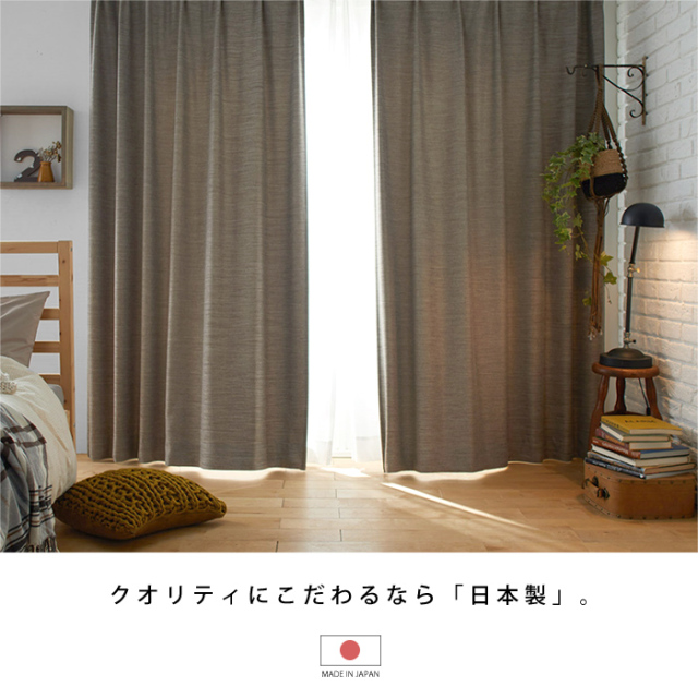 | 【日本製ドレープカーテン オフト】 (1枚入り・タッセル付き) ナチュラルな杢感のある遮光カーテンです。 上品でナチュラルなテイストは勿論、ソフトエレガントな空間にもオススメです。 適度な艶を持たせることで、どんなインテリアにも合わせやすい生地に仕上げました。 真っ暗にはなりすぎないで人の顔が分かるレベルの、ちょうどいい2級遮光を採用。 カーテンは濡れても伸縮が少なくシワになりにくい生地なので、ご家庭の洗濯機で洗濯用ネットに入れて丸洗いができ、いつでも清潔にご使用いただけます。 また、形状記憶なので、裾の広がりを抑え、きれいなウェーブとプリーツラインを持続させることができますよ。 (※形状記憶は永久的なものではございません。 洗濯を繰り返すうちに広がりやすくなる可能性がございます。) カーテンのヒダは2つ山で、1.5倍ヒダの仕様となっています。 | |