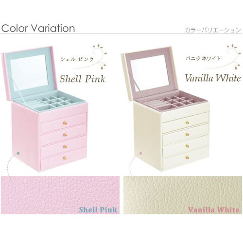 | 女性の「欲しい」から生まれたジュエリーボックス。 鏡付きはもちろん、仕切りのある引き出しや、重ねて使える小箱収納、小物はおまかせのオープン収納、そして女子力をあげる可愛いデザインは、お部屋のどこに置いててもおしゃれに華やぐおすすめのジュエリーケースとなっております。 お客様の声と女性スタッフの声との両方をカタチにしたので、お気に入りの指輪やネックレス、ピアスやイヤリングなど、お気に入りのアクセサリーを全て収納できるお洒落なアクセサリーケースですよ! | |