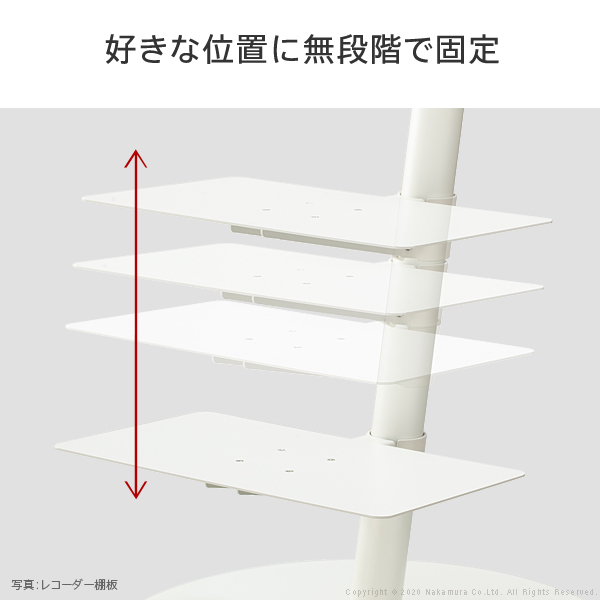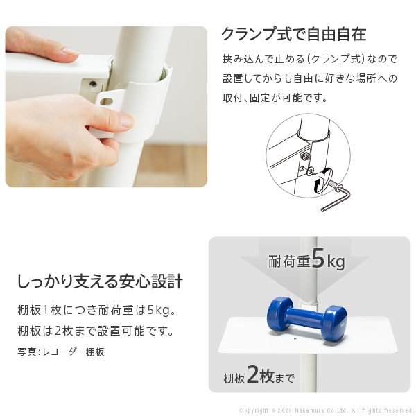 | anataIRO専用棚板 ゲーム機も設置可能なシンプルデザイン 好きな位置に無段階で固定 テレビ設置後も取付できる クランプ式 キズがつかない内側カバー付き しっかり支える安心設計 棚板一枚につき耐荷重は5kg 棚板は2枚まで設置可能です | |