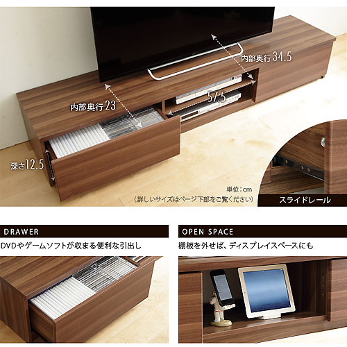 | 背面収納テレビ台ロータイプ ステラ 幅180cm 木目も美しい背面収納テレビ台 落ち着いた雰囲気の美しい木目模様を実現 お部屋に合わせて選べる3色 見苦しいコードを収納できるスペース付き 落ち着いたデザインのインテリアを好むお客様におすすめください! 実用新案登録済の背面収納スペース 配線収納で、こんなにスッキリ! テレビ周りの悩みを解決します 表から見えない背面にタップ類や機器を収納! キャスター付きで移動可能 前後に移動可能ですので、お掃除や模様替えの際もらくらく移動できます! 使いやすい充実の収納 スイスイ引き出せる引き出し2杯付き 豊富なバリエーション 3色の色に加え、様々なサイズ・形をご用意しております! 洗練の3色 ウォールナット柄、ホワイト木目調、ブラック木目調から選べます。 バランスを考えた大きさで お使いになるテレビに合わせてサイズをお選びください。 | |