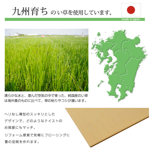 | 商品仕様 | 表地:い草(九州産) ※二・二目織 中材:フェルト15mm 裏:連結用ジョイント付(滑りにくい) |