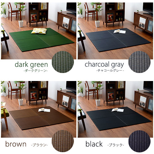 | 落ち着いた印象のユニット畳(置き畳)です。届いたユニット畳を床に置くだけで、和の空間をつくり出すことができます。 和のテイストながらシンプルなデザインで洋室の雰囲気を崩さず、お部屋や家具に合わせやすい色目にこだわった商品です。 8色のカラーを取り揃えました。ベージュ、ブラック、ブラウン、チャコールグレー、ダークグリーン、グレー、ライトグリーン、レッドの中からお好きな色をお選び下さい。複数の色を組み合わせるのもお勧めです。 子供の遊びスペースはもちろん、赤ちゃんのオムツ替え時、ストレッチや体操スペースに。洗濯物をたたむスペースや、ごろんとお昼寝するときにも。さらにこたつや敷布団の下に敷いたり使い方はあなた次第です。 表地には国産(九州産)のイ草を使用しています。一本一本が太く、表皮が厚く、繊維がキメ細かいので弾力性があり、耐久性に優れています。イ草には空気の自然浄化作用、湿度の調節作用などがあります。また、い草表面にヒバエッセンスを使用しています。青森県のヒバの木から抽出した「ヒバエッセンス」をメーカー独自の技術で生地表面に加工しました。ヒバエッセンスにはヒノキチオールという、天然物質としては極めて抗菌性の高い成分含まれています(無加工品に比べ抗菌・防臭効果があります)。 中材にはクッション性のあるウレタンフォームを使用しており、ふかふかとした踏み心地です。 本商品は軽量タイプですので、掃除や収納の際も楽に持ち運びができ、便利です。 裏面には畳と畳を連結できるよう滑りにくいジョイントを付属しております。1枚のサイズが70cm角のため、ラグと近いサイズにすることにより、畳の上にラグを敷いてもご使用いただけます。 | |