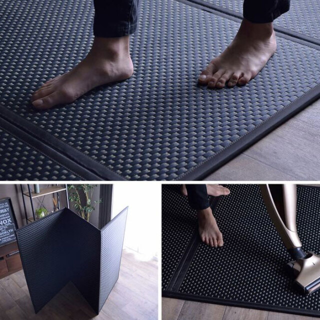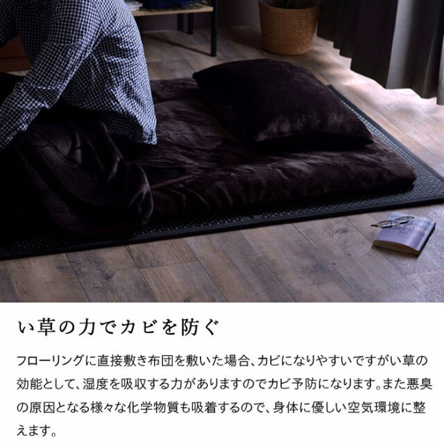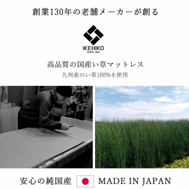 | 創業130年の老舗メーカーが作り上げた、高品質の国産のイ草を使った純日本製い草マットレスです。 抗菌防臭、吸放湿性がよく、防音効果も期待できるい草マット。 国内産の上質ない草を使用しております。日々踏みしめる場所に使うものだから、素材にこだわりました。 フローリングに直接敷き布団を敷いた場合カビになりやすいのですが、イ草の効能として湿度を吸収する力があるのでカビ予防となります。悪臭の原因となる様々な化学物質も吸着するため、身体に優しい空気環境に整えます。 軽量タイプでカンタンに持ち運びができます。三つ折りにできるから狭い場所へ収納も可能。 裏面は不織布なのでフローリングに直接敷いても傷つくことなく安心してお使いいただけます。 フローリングに似合うデザインで、こたつとも相性がよく年中お使いただけます。 | |