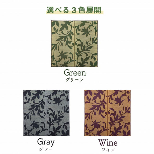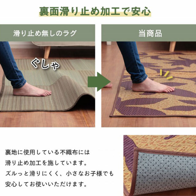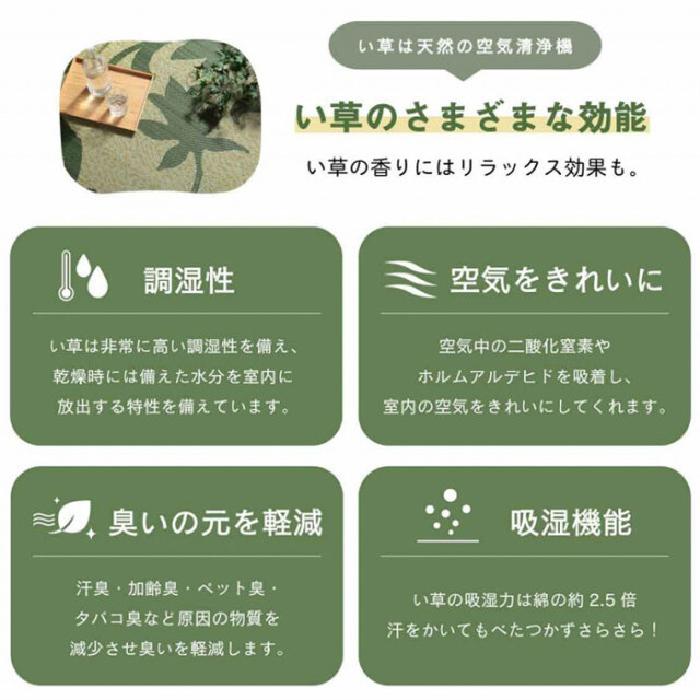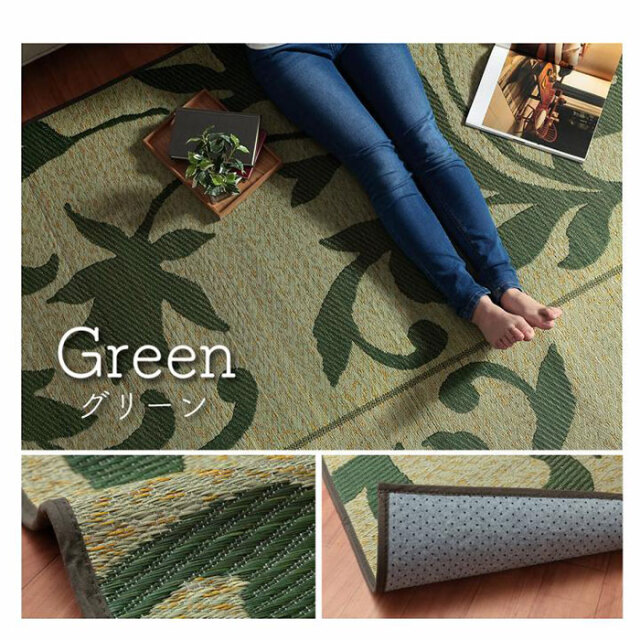 | 商品仕様 | 表地:い草 ※三重織 裏地:ポリエステル100%【不織布】※滑りにくい加工付き ヘリ:ポリエステル100% |