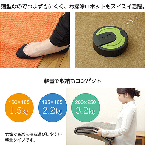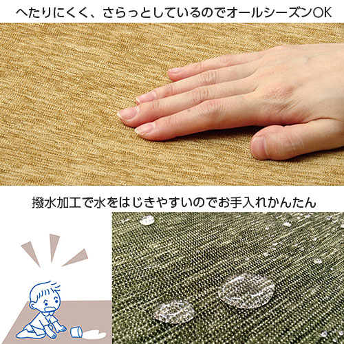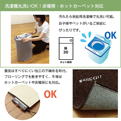 | 洗濯機で丸洗い可能なラグカーペットです。 やわらかなタッチと光沢感が特徴のシェニール織りは、べたつきにくく、オールシーズンお使いいただけます。 撥水加工を施していますので、お子様がいるご家庭でもお手入れかんたん。 軽量、コンパクトで女性でもお手軽に収納、持ち運び可能。 ホットカーペット、床暖房に対応しているのもポイント。 7色のカラーと3種類のサイズをご用意しました。 | |
