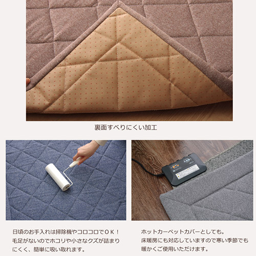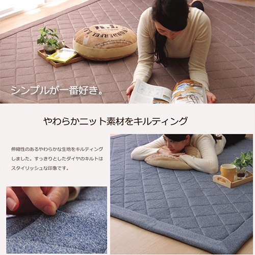 | 伸縮性のあるやわらかな生地をキルティングしました。 すっきりとしたダイヤのキルトは スタイリッシュな印象です。 固綿入りだから、ほどよいクッション性 暮らしに嬉しい機能も充実裏面は すべりにくい加工をしています。 日頃のお手入れは掃除機やコロコロでOK 毛足がないのでホコリや小さいクズが詰まりにくく 簡単に吸い取れます。 ホットカーペットカバーとしても。 床暖房にも対応していますので寒い季節でも 暖かくご使用頂けます。 夏はさらっとしていて心地よく 冬はこたつ敷きとしても使える 飾らない日常の暮らしにマッチする1枚です。 | |