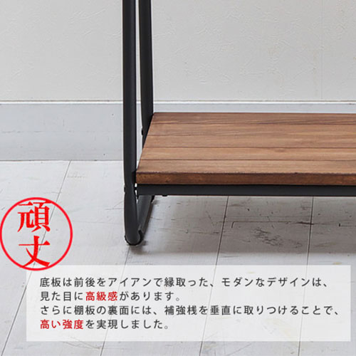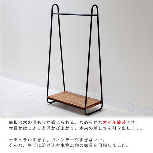 | アイアン×パイン材に丁寧なオイル仕上げを施したシリーズ。 温もりのある天然木の家具は、そこにあるだけでお部屋をやさしい表情に変えてくれます。 板厚20mmのどっしりとしたパイン材を使用。 突板や合板にはない、"本物"の良さがあり、長く使うほどに愛着と味わいが増すのが特徴です。 天板は四方をアイアンで縁取った、ミッドセンチュリー風のモダンなデザイン。 さらに、ハンガーをかけるポールを二本にしたり、底板の前後をアイアンで縁取ったりと、重厚感のある仕上がりです。お部屋の雰囲気が引き締まるミッドセンチュリー風の"黒"、それでいて印象は軽やか。 木目がはっきりと浮かび上がり、本来の美しさを引き出します。 ナチュラルすぎず、ヴィンテージすぎない…。 そんな、生活に溶け込む本物志向の家具を目指しました。 | |