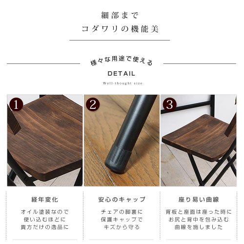 | 天然木のパイン材を植物性のオイル加工を施し、ヴィンテージの風合いとアンティークの美しさを醸し出す、デザイン家具アグエロ。 美しいデザイン 折りたたみチェアーの登場です。 天然木(パイン)の板を個性的なブロック状に組み合わせて作る事で、デザイン性を極限まで高め、ブラックスチールとのカラーコントラストがデザインを引き締める究極の仕上がりです。 植物性のオイルを使っているので、ホルムアルデヒド、トルエン、キシレンなどの有害物質が含まれておらず、お子様のいるご家庭でも安心で安全。 使わない時は折り畳んで隙間に片付けれてとっても便利。 デザイン性と機能性・安全性を突き詰めた、お洒落なデザインです。 | |