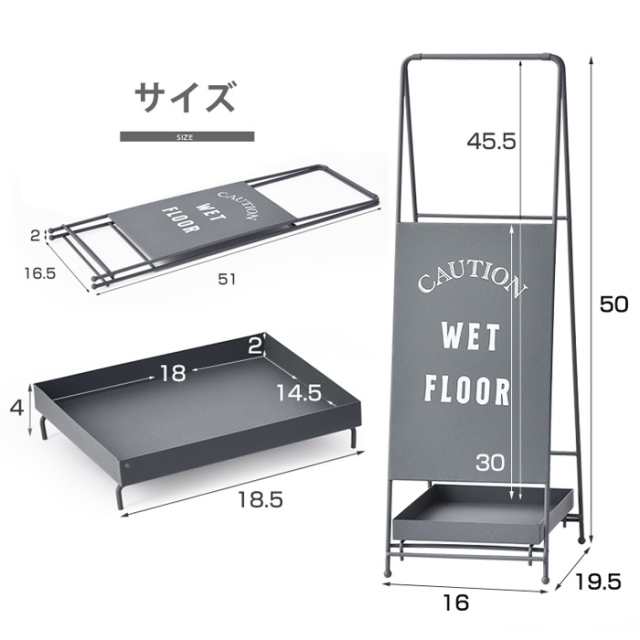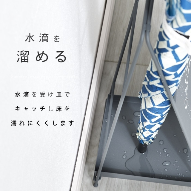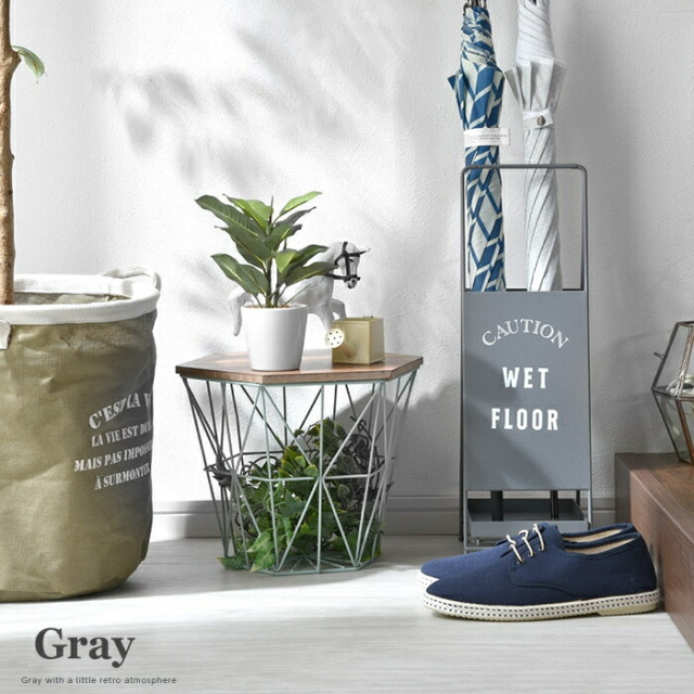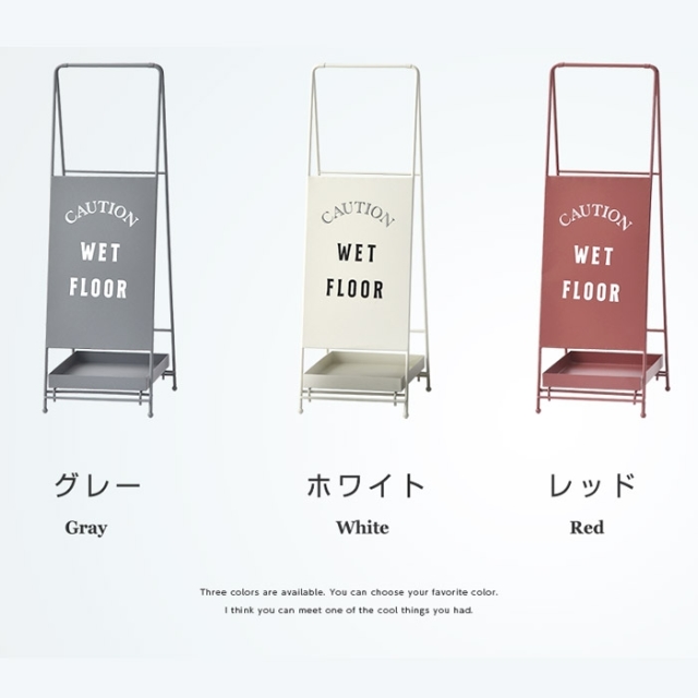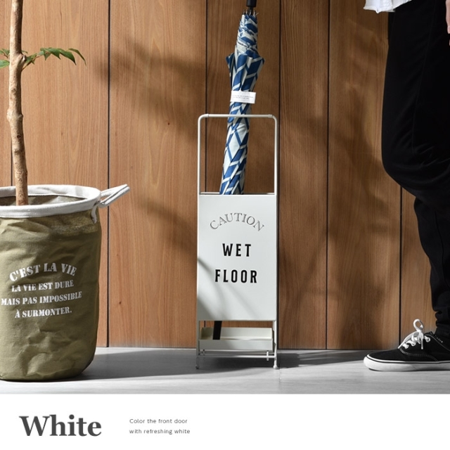 | 正面にはおしゃれな文字をペイント シンプルな大人の演出 表面は少しレトロな印象となるよう ザラっとした風合いの塗装を施しています。 下部にはトレイがついており 傘についた水滴をキャッチする便利なトレイと なっております。 また、傘立てでは珍しく折畳みができるように なっていますので使わない時は折り畳んで頂けます。 | |