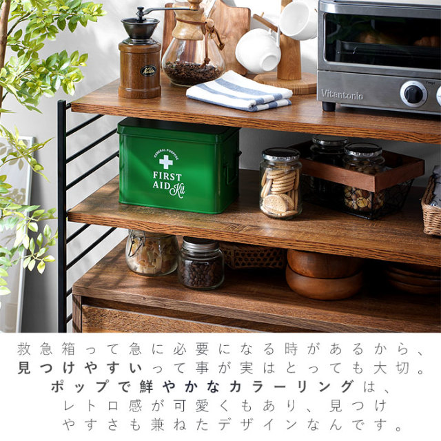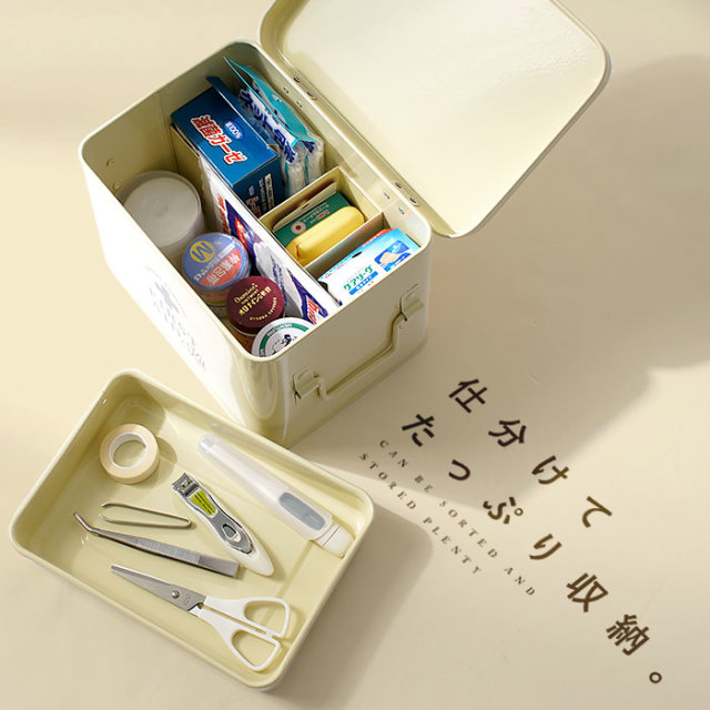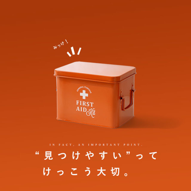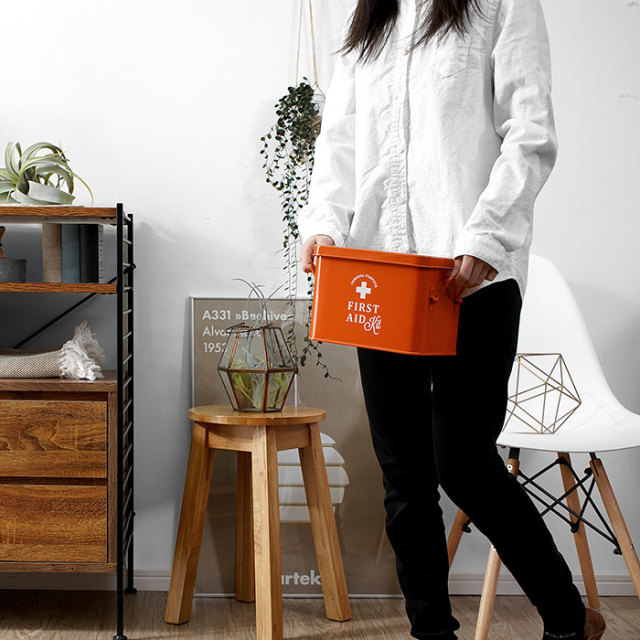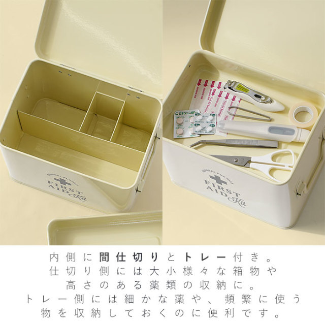| 救急箱だっておしゃれにしたい。そんなあなたにピッタリのかわいい救急箱が登場です。 蓋を開けると、中段にトレーが付いており、トレーを外すと下段は間仕切りのついた収納になっています。 下段の仕切り収納側には、大小様々な箱物や高さのある薬類の収納に。 トレー側には細かな薬や、頻繁に使う物を収納しておくのに便利です。 救急箱って、けがをしてしまった時など急に必要になる場合があるから、見つけやすいってことが実はとっても大切。 本体正面には、シンプルでわかりやすいアイコンプリントを施してわかりやすく、本体のポップで鮮やかなカラーリングは、 レトロ感がかわいくもあり、見つけやすさも兼ねたデザインなんです。 本体両サイドに持ち手付き。持ち運びもラクラクです。 | |