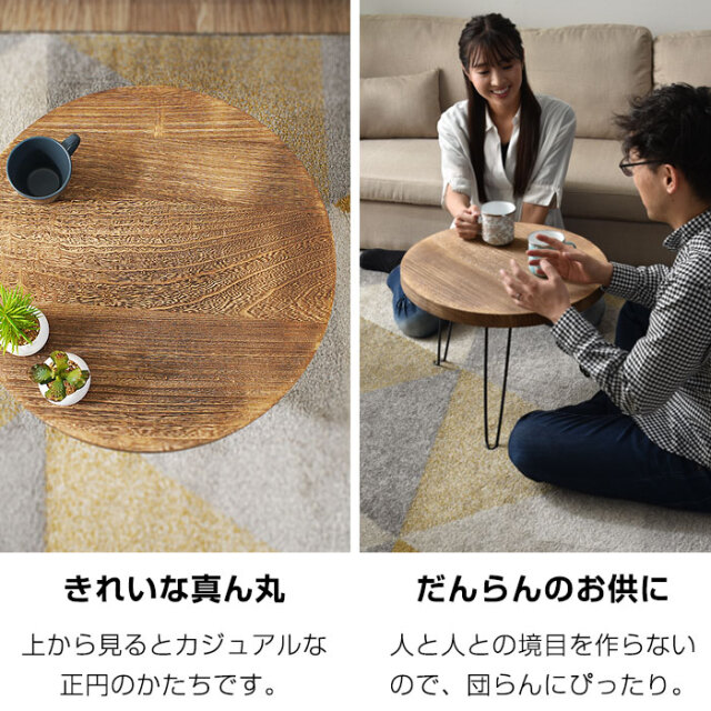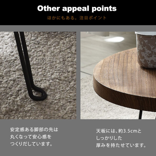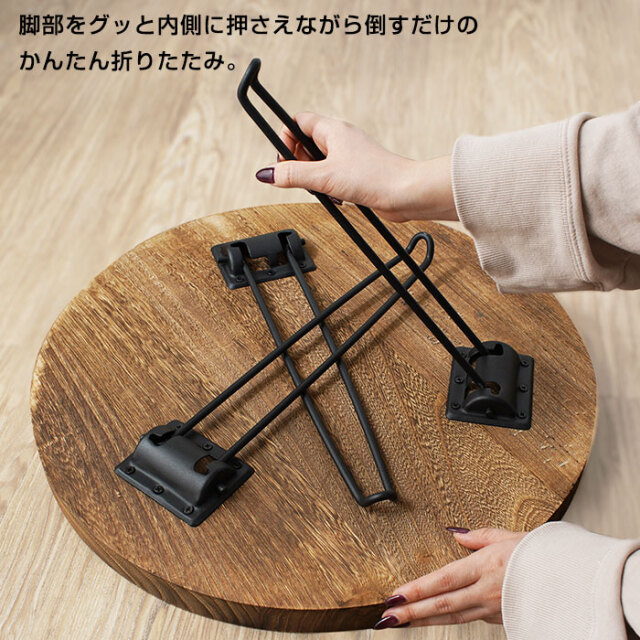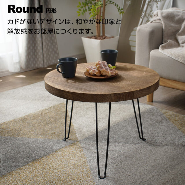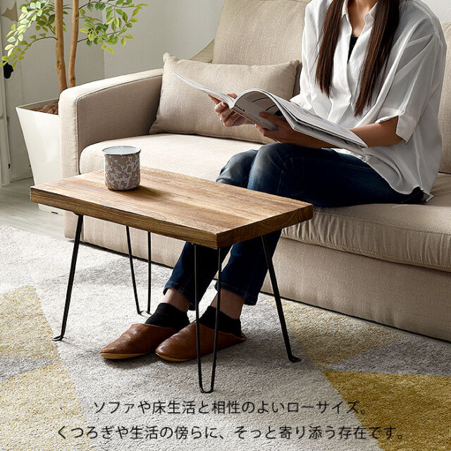 | 天然木×スチールがつくるヴィンテージな雰囲気のあるデザインの折り畳みテーブルです。 温かみのある木材とそれを引き締めるブラックスチール。重厚感を感じさせる絶妙な組み合わせがお部屋に雰囲気をつくりだします。 焼き加工を施して雰囲気をだした天然木の天板からは、二つとない木目の柄や独特の手触りがします。天然木の存在感をそのまま活かした天板は木そのままの雰囲気を感じ取ることができます。 折りたたむことができるので、ちょっとしたすき間に片付けておくことができます。本体も(約)2.8kgと持ち運びやすい重量となっています。 コンパクトながらも使いやすいローサイズ。ソファや床座生活がお好きな方にも使いやすい高さに設定されています。 天板の形状はお好みから選ぶことができます。 | |