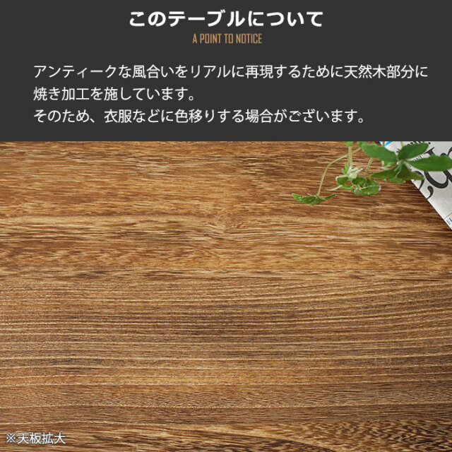 | 注意事項 | ・天然木を使用しているため、若干色味などが異なる場合がございますのでご了承ください。 ・シミ、塗装剥げのような箇所は風合いを出す為の加工であり製品の不都合ではありません。 ・天然木製のため、天板に加熱した鍋や湯沸かし器などを直接置かないでください。 ・焼き加工を施していますので、衣服などに色移りする場合がございます。 |
