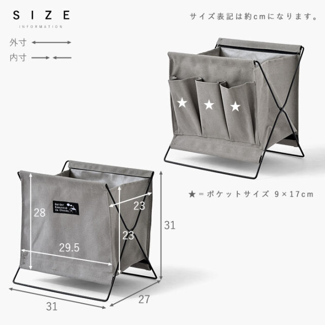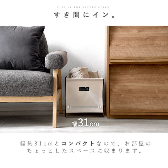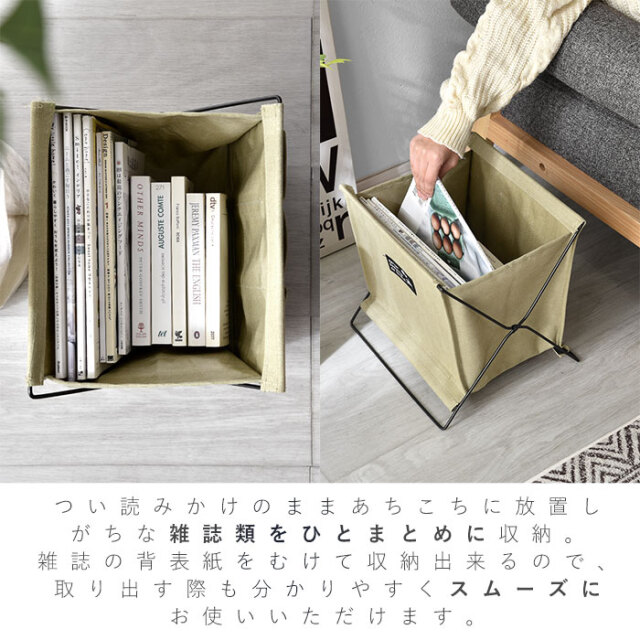 | つい読みかけのままあちこちに放置しがちな雑誌類。ざっくりでも一カ所にまとめてあるだけで、お部屋は片付いて見えます。 雑誌の背表紙を向けて収納出来るので、取り出す際も分かりやすくスムーズにお使いいただけます。 いろんな場所で使える汎用性の高さが魅力。 ・細々とした食料品類を収めてキッチンストッカーとして。 ・子供部屋のちょっとしたおもちゃ収納に。 ・リビングで膝掛けやクッション類の置き場所として。 ・洗面所や洗濯機置き場で洗剤やタオル入れなどにも。 ・ビニール袋を被せればゴミ箱としてもお使いいただけます。 幅約31cmとコンパクトなので、お部屋のちょっとしたスペースに収まります。 本体生地にはハリのあるキャンバス生地を使用。裏地はPEコーティングが施され撥水性に優れています。 (※長時間濡れた物を入れないでください。) 複数台で使うのもおすすめ。シンプルデザインだからお部屋のイメージを崩さずすっきりきれいなお部屋に。 | |