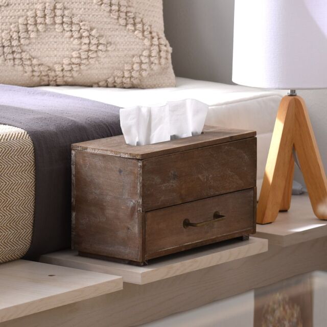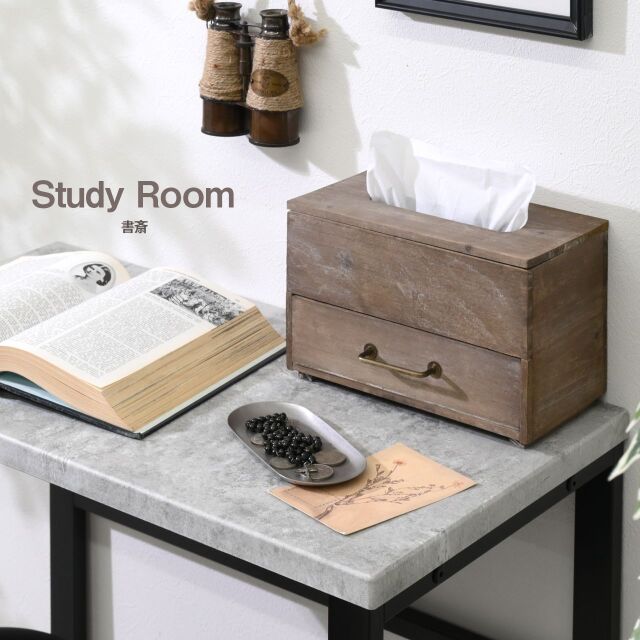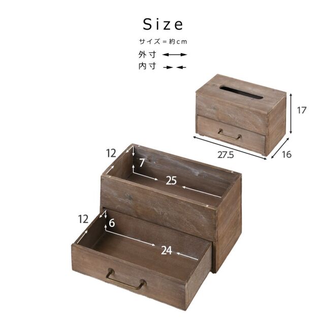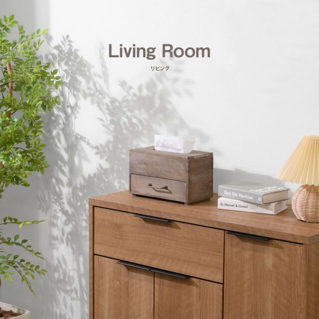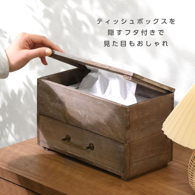 | おしゃれなヴィンテージ風デザインで どんなインテリアにも合わせやすく ティッシュケースや小物をオシャレに収納 コスメやアクセサリーの収納に最適な引出し付きで リップやマスカラも収納可能 ティッシュボックスを隠すフタ付きで 見た目もおしゃれ 木目と木の節がもたらす ヴィンテージテイスト 天然の木材を使用し美しい木目と独自の 木の節を活かしたデザインが特徴です。 | |