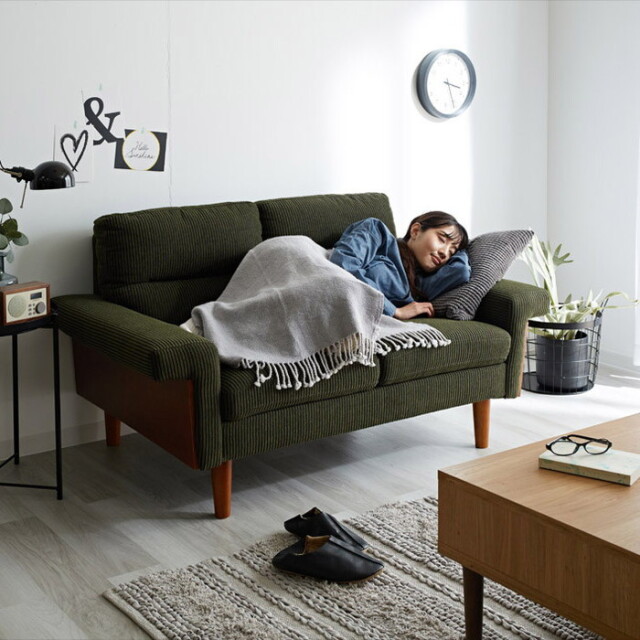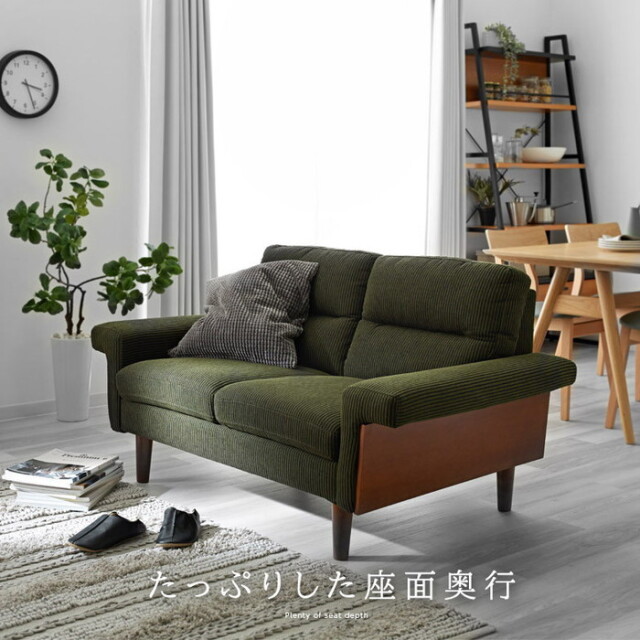 | コーデュロイ生地が暖かさや 高級感を醸し出すおしゃれなソファ 側板は高級感のあるウォールナット突板で ダークグリーンの落ち着いたコーデュロイのカラーと ウォールナットのカラーの組み合わせが お部屋をぐんとおしゃれな空間に生まれ変わります 中材にはSバネとウェービングベルトを使用し しっかりしとした腰のある座り心地になっております | |