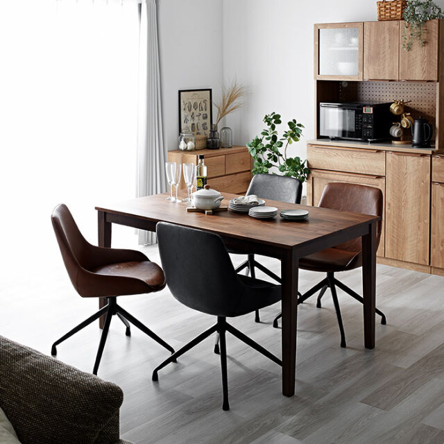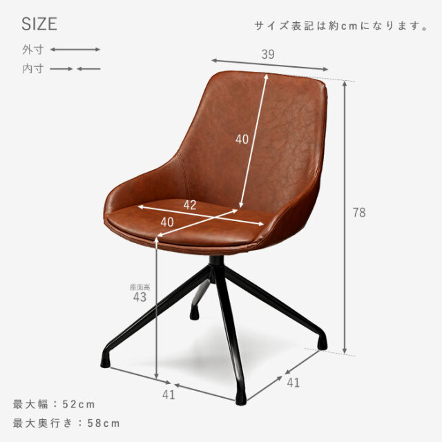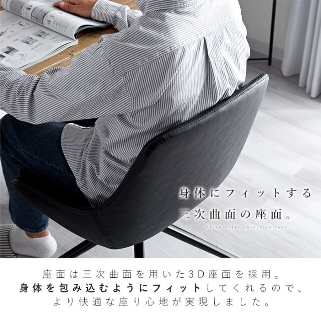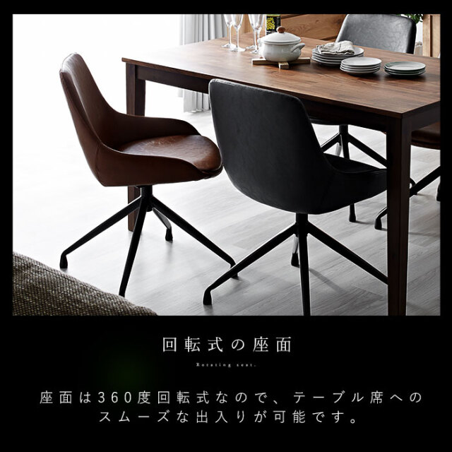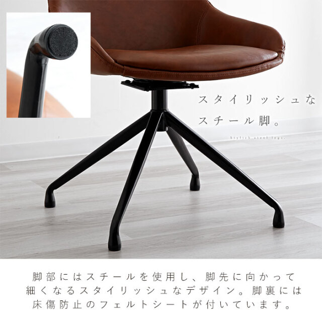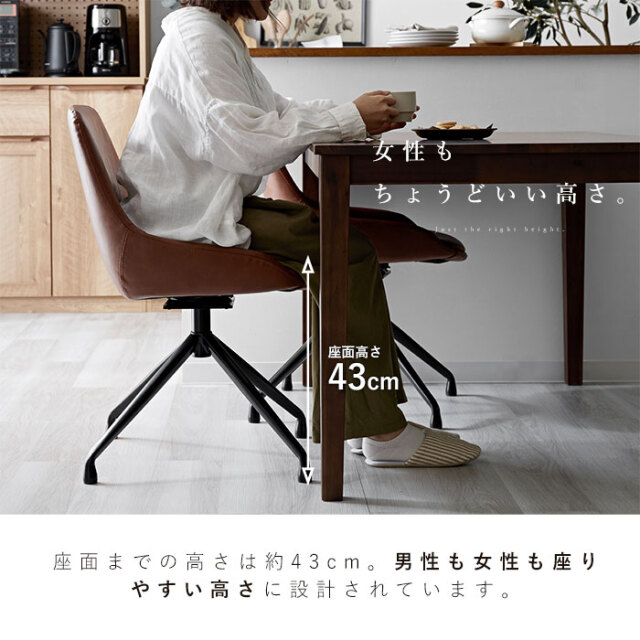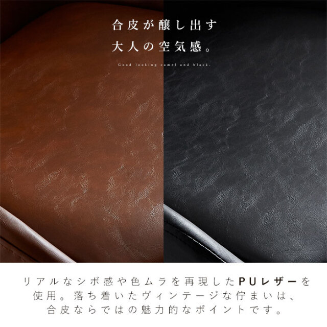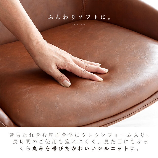 | 大人っぽさと品の良さ。お部屋を引き立て、確かな存在感を感じさせてくれるバランスの取れたチェアです。 身体を包み込むようなラウンドシルエットが特徴的です。 シンプルながらも合皮の醸し出すヴィンテージ感に、裾に向かって細くなるスタイリッシュな脚部デザイン。 背もたれから両サイドにかけて包み込むようなシルエットなど、確かな存在感を感じさせてくれます。 座面は三次曲面を用いた3D座面を採用。身体を包む混むようにフィットしてくれるので、 より快適な座り心地が実現しました。 背もたれ含む座面全体にウレタンフォーム入り。長時間のご使用も疲れにくく、 見た目にもふっくら丸みを帯びたかわいいシルエットに。 座面までの高さは約43cm。男性も女性も座りやすい高さに設計されています。 耐荷重も約80kgと、安心してお使いいただけるしっかりとしたつくりです。 座面は360度回転式なので、テーブル席へのスムーズな出入りが可能です。 リアルなシボ感を再現したPUレザーを使用。 落ち着いたヴィンテージな佇まいは、合皮ならではの魅力的なポイントです。 | |
