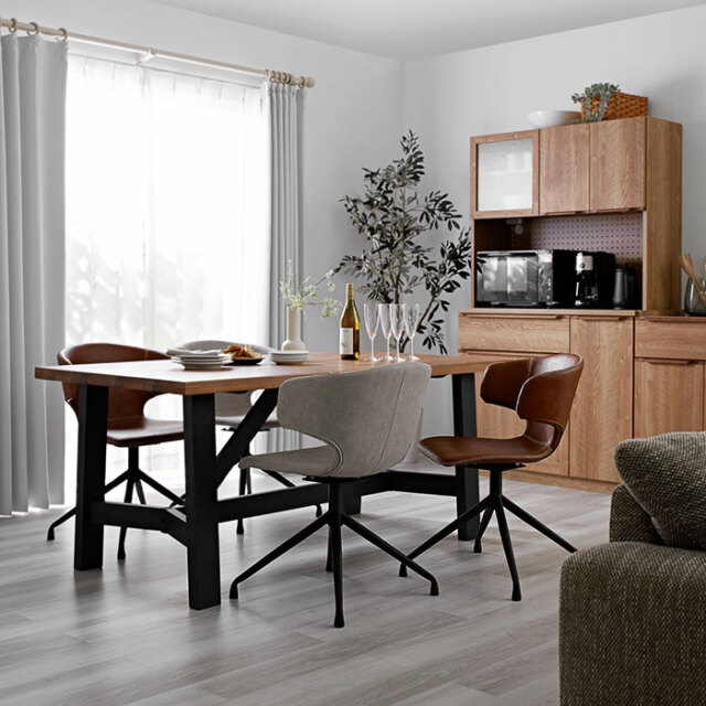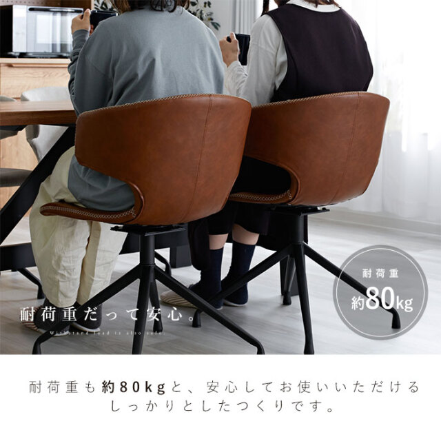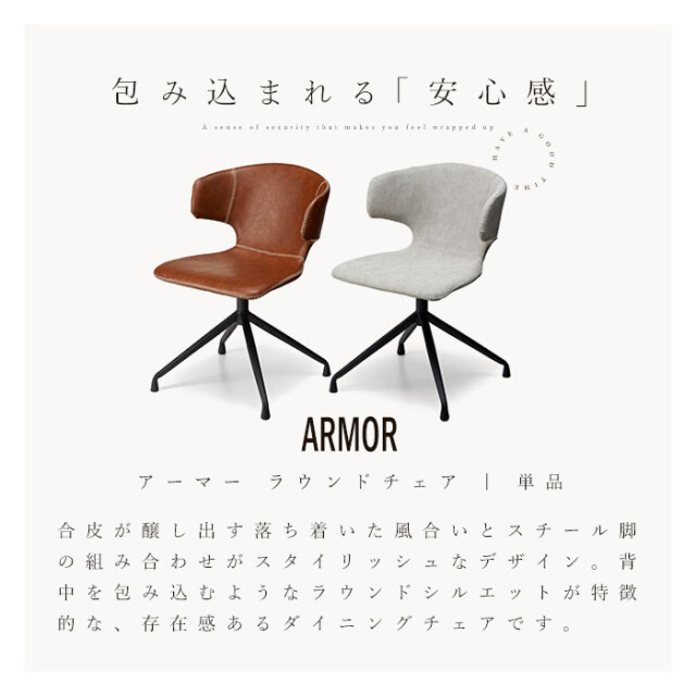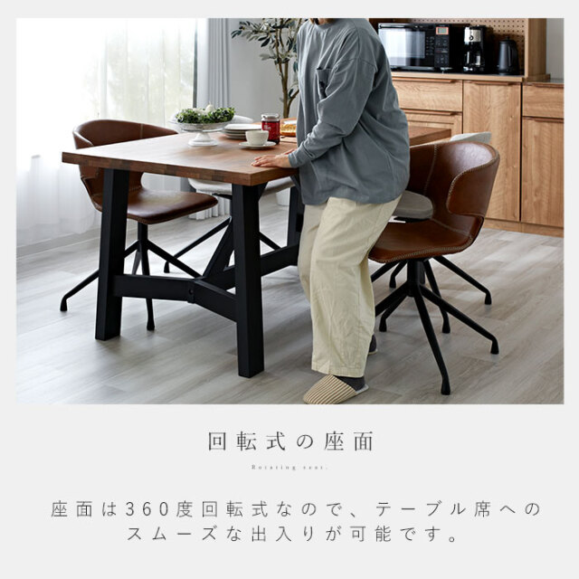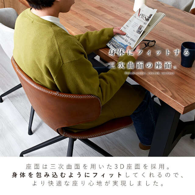 | 合皮が醸し出す落ち着いた風合いとスチール脚の組み合わせがスタイリッシュなデザイン。 背中を包み込むようなラウンドシルエットが特徴的な、存在感あるダイニングチェアです。 くるっと背を囲むようなシルエットが特徴的なチェアです。向かい合わせで置くことで、 空間と空間を隔てる役割を果たし、ダイニングの空間を創り出します。 座面は三次曲面を用いた3D座面を採用。 身体を包み込むようにフィットしてくれるので、より快適な座り心地が実現しました。 背もたれ含む座面全体にウレタンフォーム入り。 長時間のご使用も疲れにくく、見た目にもふっくら丸みを帯びたかわいいシルエットに。 座面までの高さは約44cm。男性も女性も座りやすい高さに設計されています。 耐荷重も約80kgと、安心してお使いいただけるしっかりとしたつくりです。 座面の縫い合わせはジグザグステッチの仕立てで、シンプルな座面のアクセントに。 座面は360度回転式なので、テーブル席へのスムーズな出入りが可能です。 リアルなシボ感を再現したPUレザーを使用。 落ち着いたヴィンテージな佇まいは、合皮ならではの魅力的なポイントです。 | |