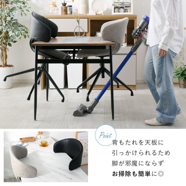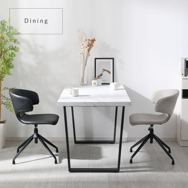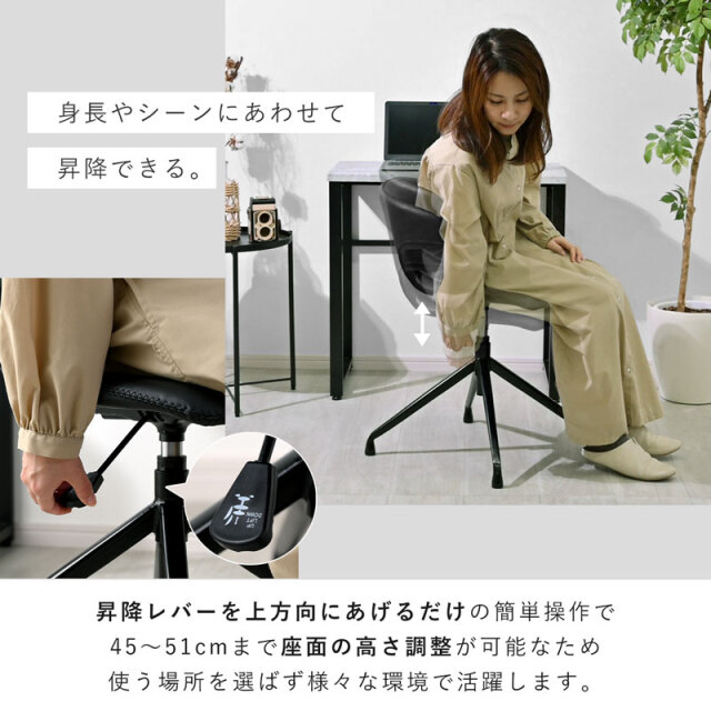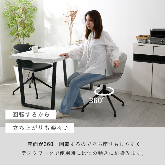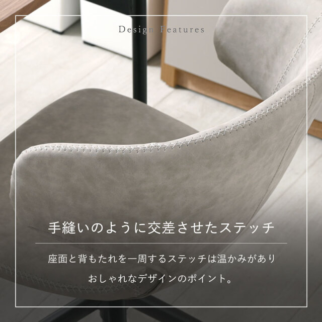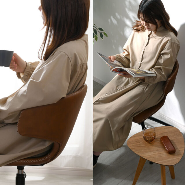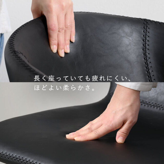 | デザインと機能性。 すっきりとしたフォルムと包み込むようなデザイン。 落ち着いた色合いで、年齢層や雰囲気を選ばずお使いいただけます。 人やシーンに合わせて座面が上下昇降できたり、座面が360度回転するため、立ち座りがしやすいのもポイントです。 アームはちょっとした肘置きにしてリラックスできますよ。 昇降レバーを上方向にあげるだけの簡単操作で45~51cmまで座面の高さ調整が可能なため、ダイニングやデスクなど使う場所を選ばず活躍します。 回転する座面は、デスクワークで使用時には体の動きに馴染むため、リモートワークにも最適です。 お手入れしやすい合成皮革(PU素材)を採用。 少し凹凸のある質感は本革のような高級感と柔らかな肌触りを持ちながら、汚れが付きにくく、拭き取りやすいため、耐久性とメンテナンスの容易さも魅力です。 座面と背もたれを一周するステッチは温かみがあり、おしゃれなデザインのポイントです。 | |