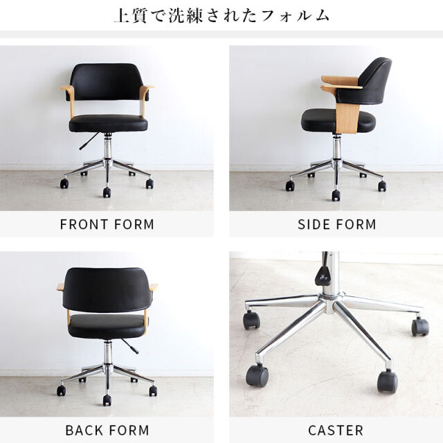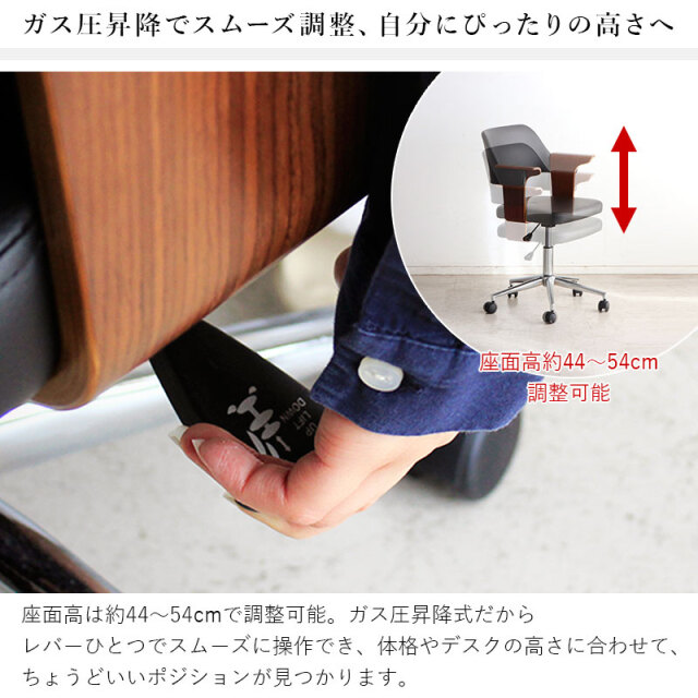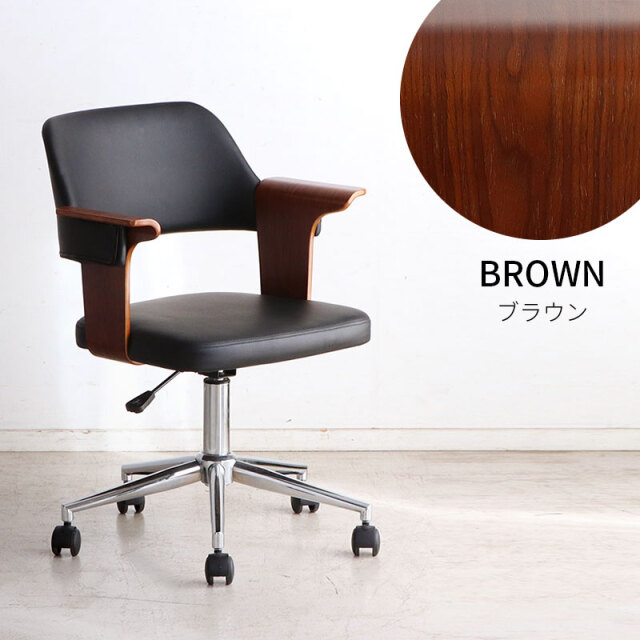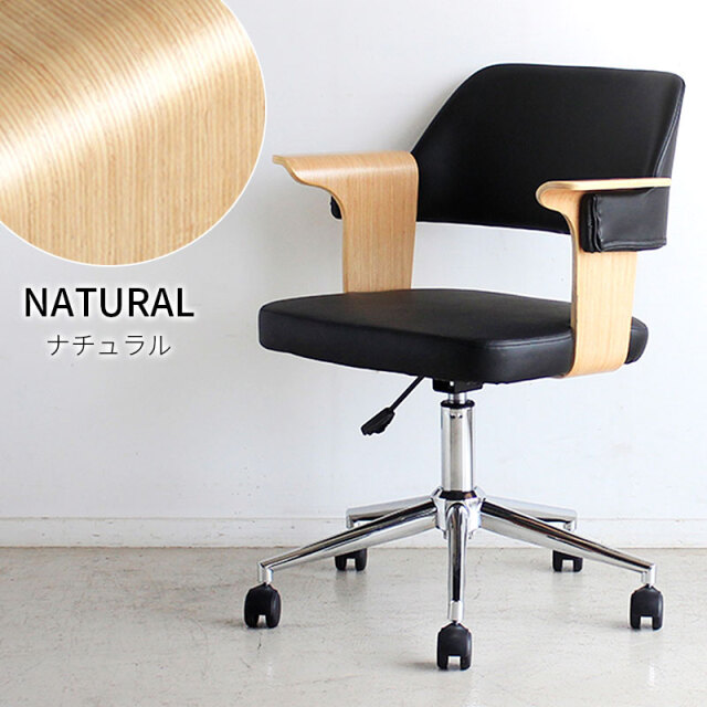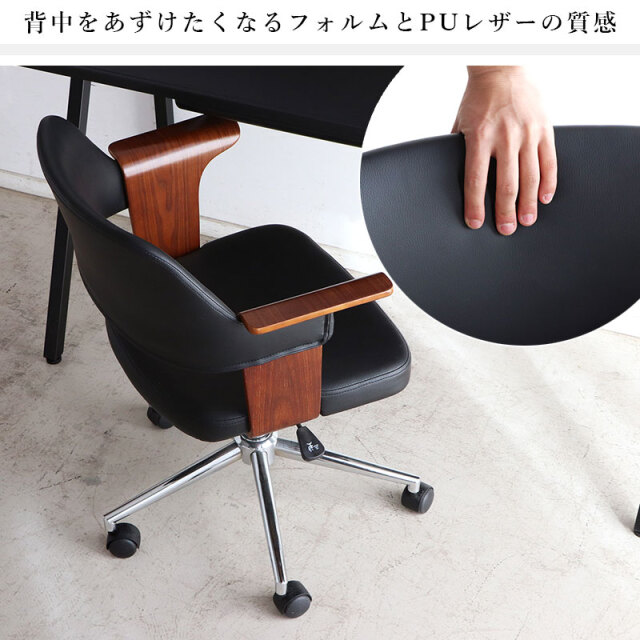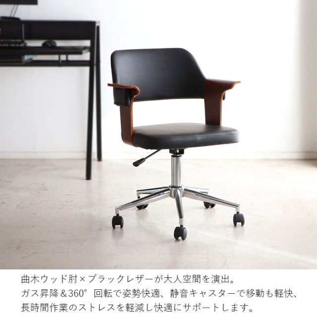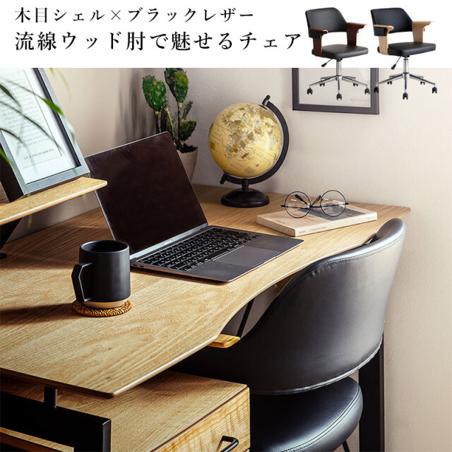 | 曲木ウッド肘×ブラックレザーが大人空間を演出。 ガス昇降&360°回転で姿勢快適、静音キャスターで移動も軽快、長時間作業のストレスを軽減し快適にサポートします。 ゆるやかな背面のカーブとヴィンテージ調PUレザーの風合いが融合。 体をやさしく支え、緊張をほどくような安心感を演出。 長時間の作業にも、自然と背を預けたくなる一脚。 ナチュラルとブラウン、選べる2色の木目調アームが魅力。 約7cmのゆったり幅で肘をしっかり支え、作業中もくつろぎタイムも快適な姿勢をサポートします。 | |