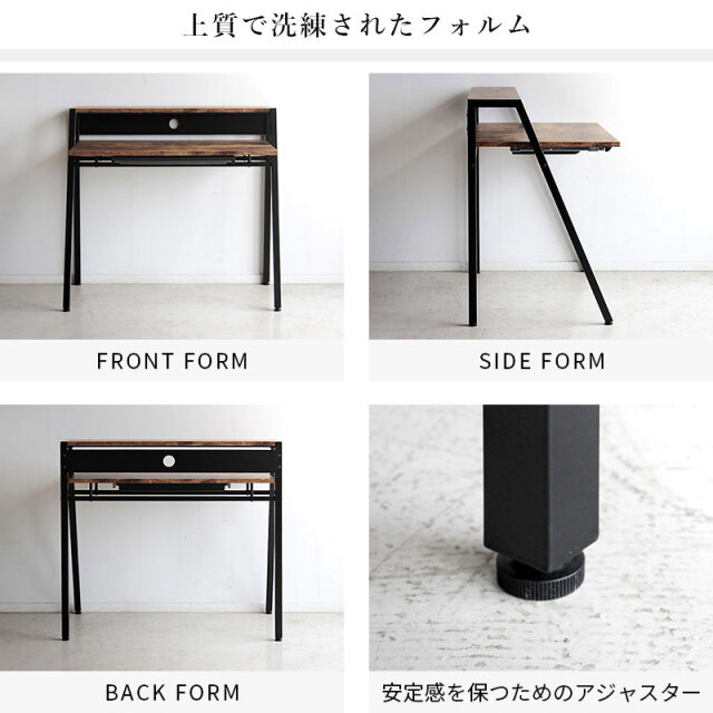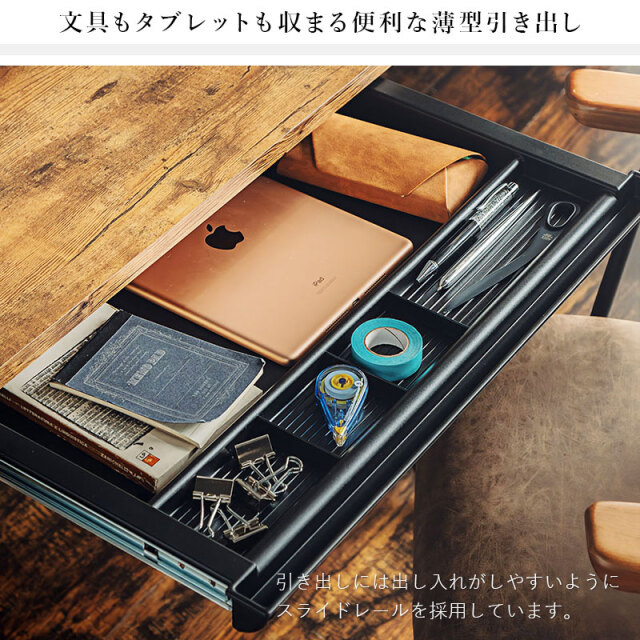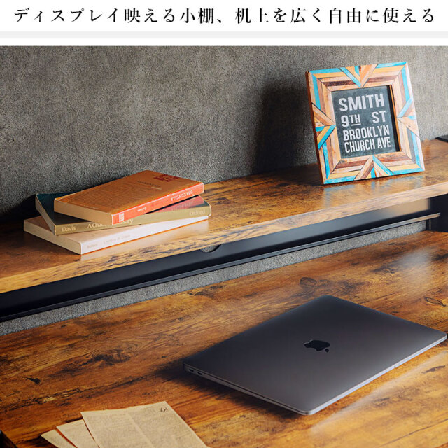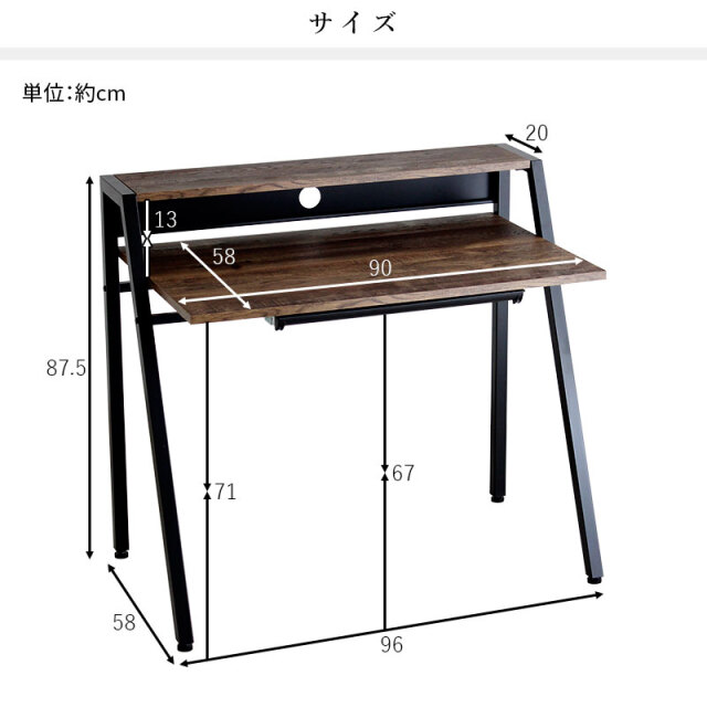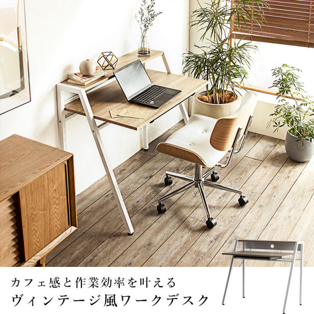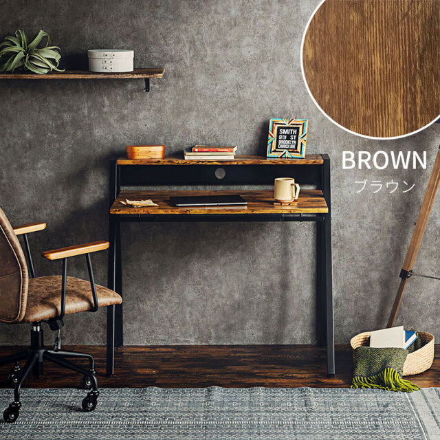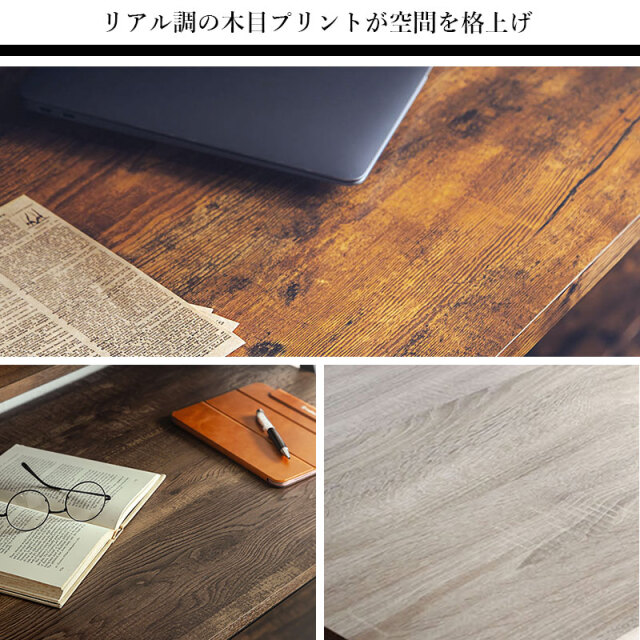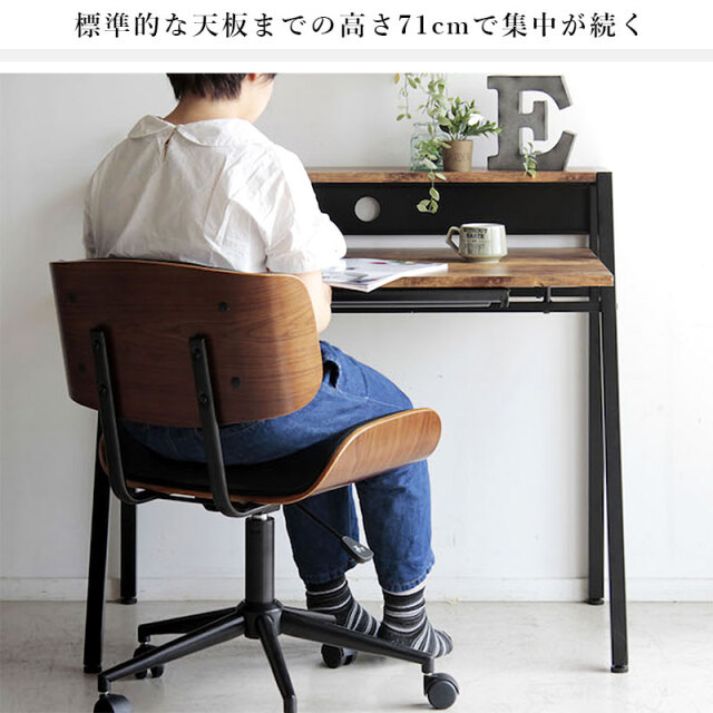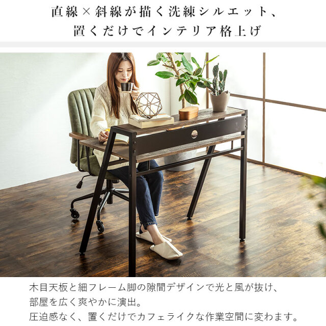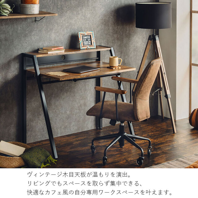 | ヴィンテージ木目天板が温もりを演出。 リビングでもスペースを取らず集中できる、快適なカフェ風の自分専用ワークスペースを叶えます。 厚さ約2cmの重厚天板と錆び・汚れ・傷に強い粉体塗装スチール脚が頼もしさをプラス。背面コード穴で配線もすっきり、木目調が空間を格上げするデザインと機能を両立し、長く愛せます。 標準高71cmで姿勢キープし集中力を維持。 幅約90cm×奥行約58cmのワイド天板はノートPCとA4資料を同時に広げても余白たっぷり、作業効率をぐんと大幅アップさせます。 | |