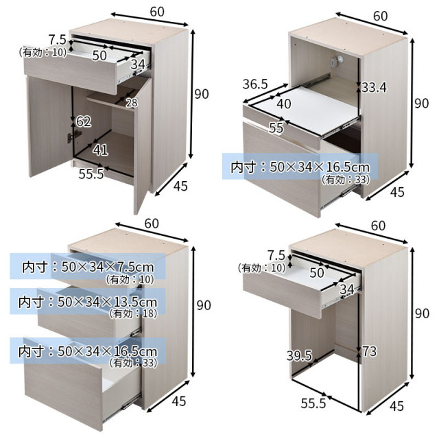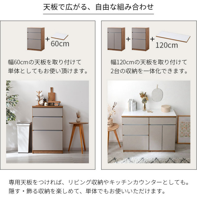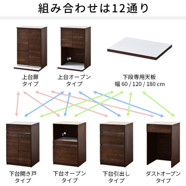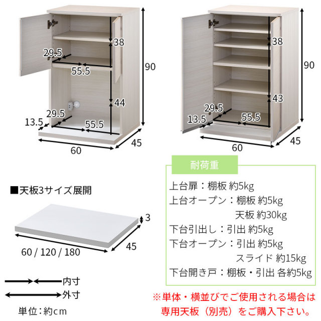 | 商品重量 | 上台扉タイプ:(約)19kg 上台オープンタイプ:(約)15kg 下台引出しタイプ:(約)26kg 下台オープンタイプ:(約)21kg 下台開き戸タイプ:(約)20kg 下台ダストタイプ:(約)14kg 天板60:(約)3kg 天板120:(約)7kg 天板180:(約)10kg |