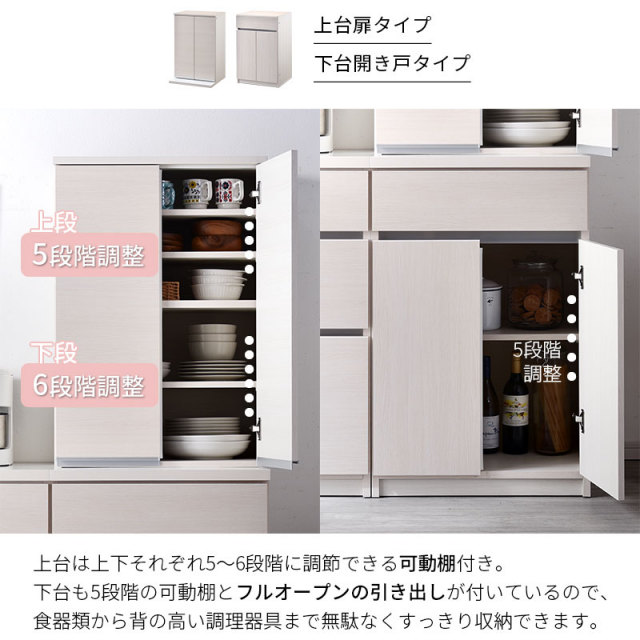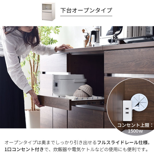 | 耐荷重 | 上台扉タイプ/棚板:(約)5kg 上台オープンタイプ/棚板:(約)5kg、天板:(約)30kg 下台引出しタイプ/引出:(約)5kg 下台オープンタイプ/引出:(約)5kg、スライドカウンター:(約)15kg 下台開き戸タイプ/棚板:(約)5kg、引出:(約)5kg 下台ダストタイプ/引出:(約)5kg 天板60:(約)30kg 天板120:(約)30kg 天板180:(約)60kg |