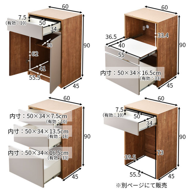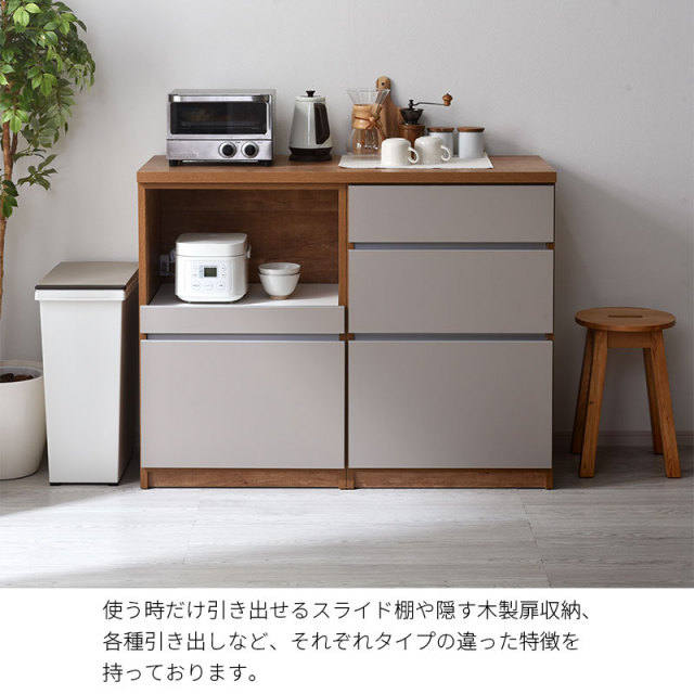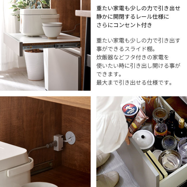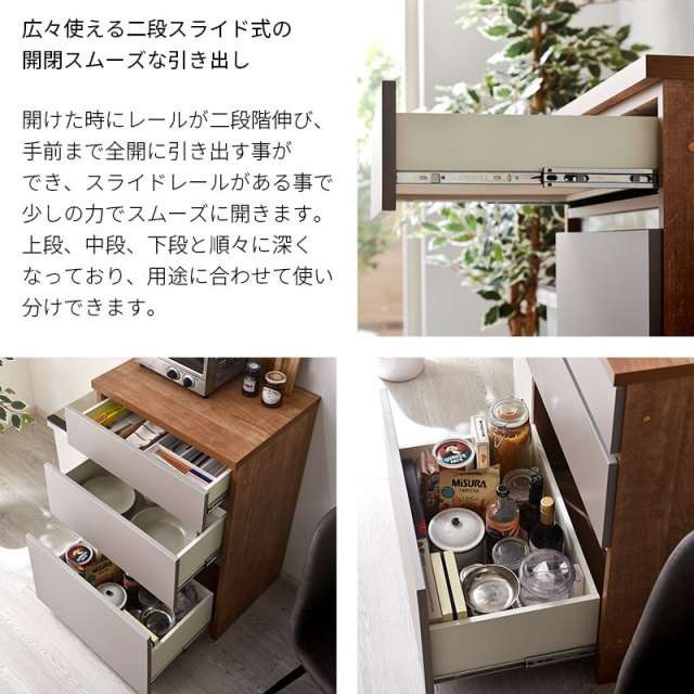 | 耐荷重 | 下台引出しタイプ/引出:(約)5kg 下台オープンタイプ/引出:(約)5kg、スライドカウンター:(約)15kg 下台開き戸タイプ/棚板:(約)5kg、引出:(約)5kg |