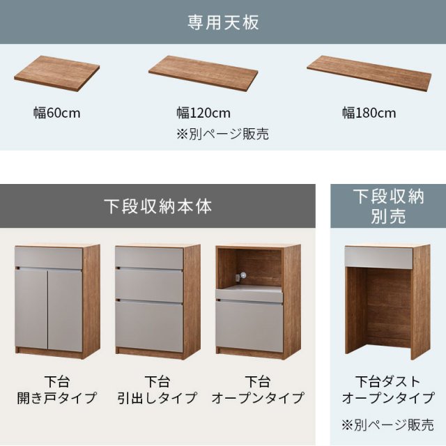 | 取扱タイプ | 引出し/ナチュラルグレージュ、オープン/ナチュラルグレージュ、開き戸/ナチュラルグレージュ |