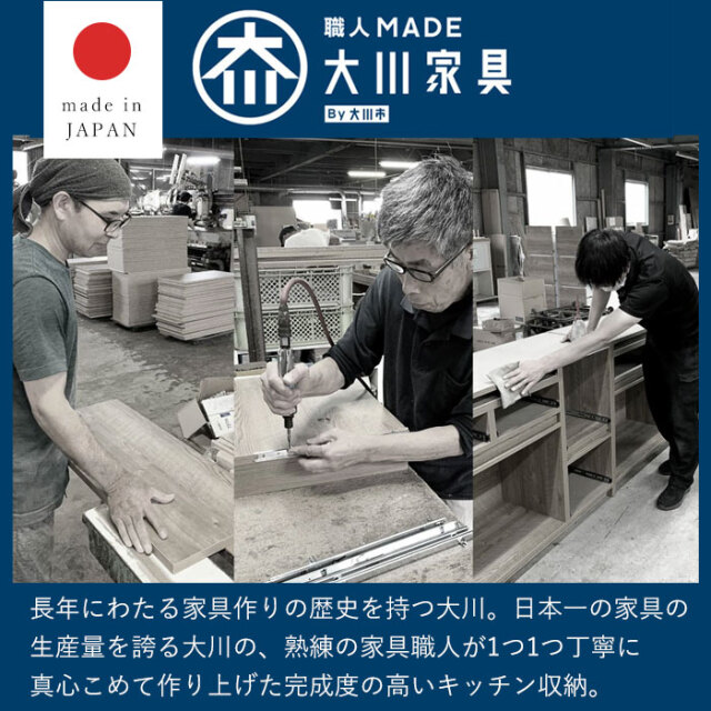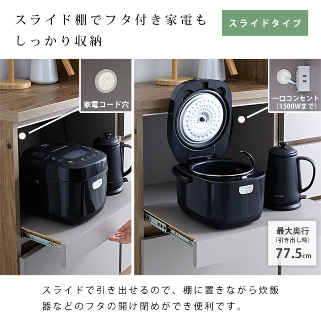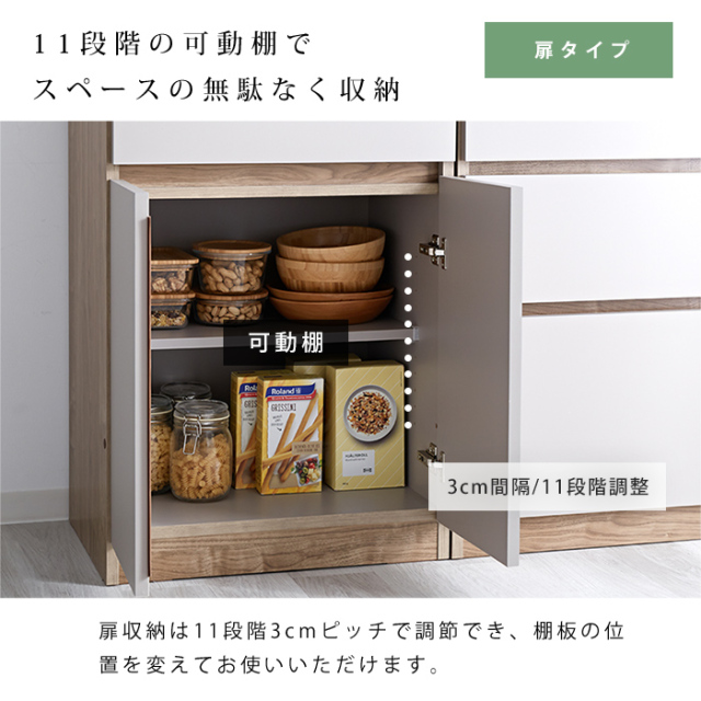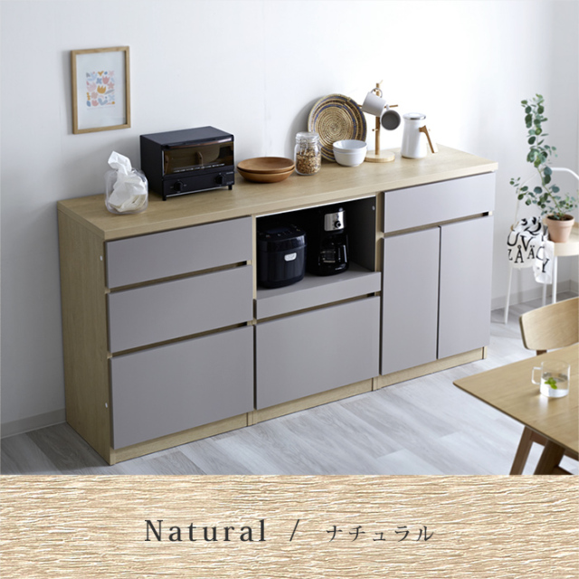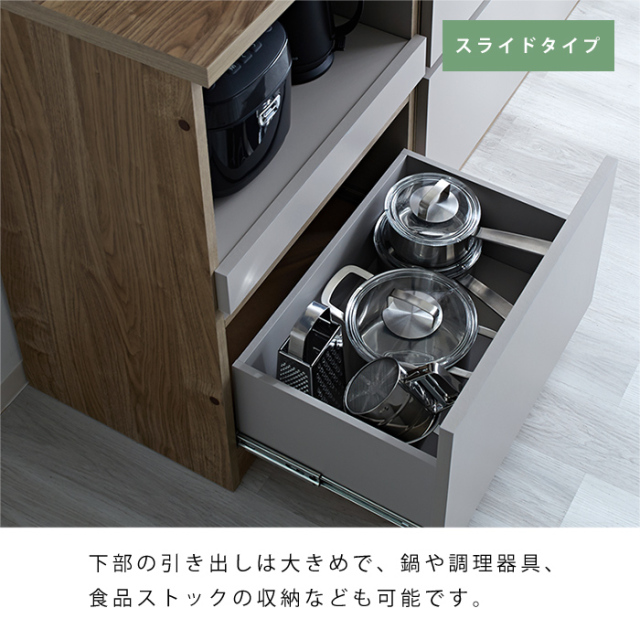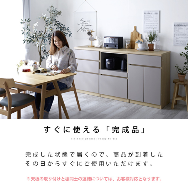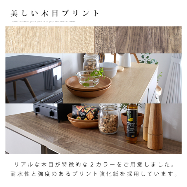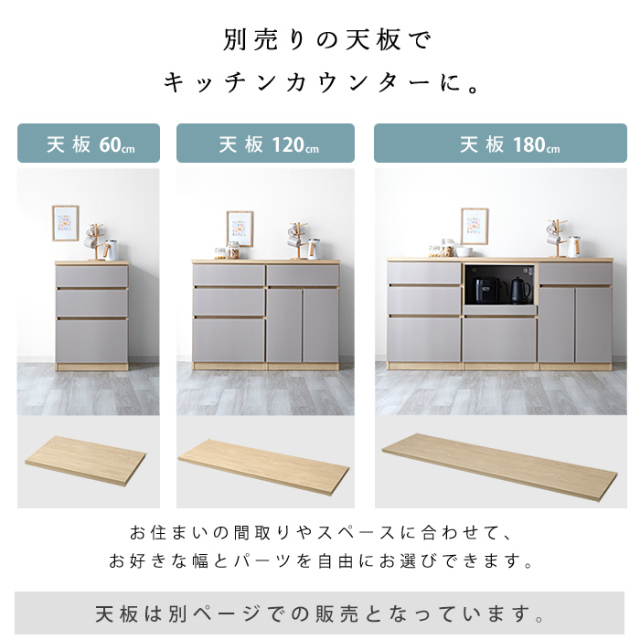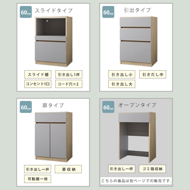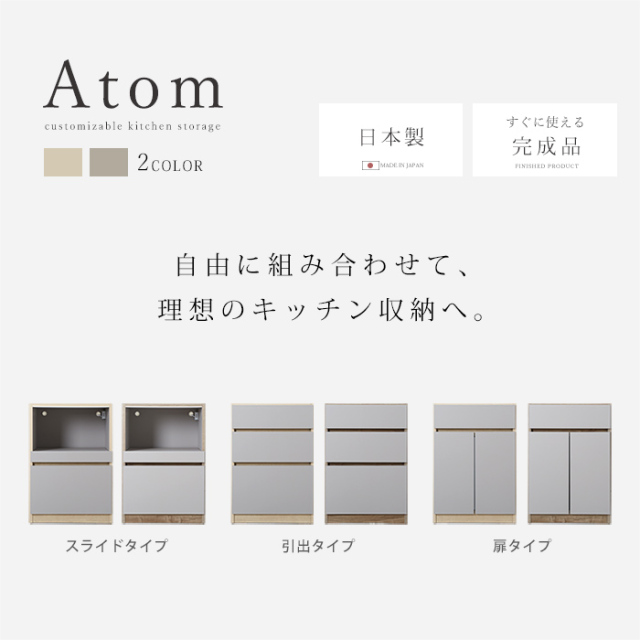 | 自由に組み合わせて、理想のキッチン収納へ。 【ユニット キッチン収納60cm アトム】 明るめグレーの落ち着いた前板カラーに木目模様で温かさをプラス。 洗練されたデザインの中にぬくもりを感じる北欧風のモダンなキッチン収納。 熟練の家具職人が仕上げた日本製で永く日常に寄り添ってくれる商品です。 リアルな木目が特徴的な2カラーをご用意。 耐水性と強度のあるプリント強化紙を採用しています。 〇スライドタイプ 炊飯器などを置けるスライドと下部に大きめの引き出し一杯 コンセントとコード穴付き 〇引出タイプ 大・中・小の引き出し3杯 〇扉タイプ 扉を開けると可動棚付きの収納スペース 上部に引き出し一杯 〇オープンタイプ ゴミ箱を中に納められる 上部に引き出し一杯 ※オープンタイプは別ぺージでの販売となってます。 上記4商品から、あなたの理想の収納空間をお作りいただけますよ。 同シリーズの天板を設置すればキッチンカウンターとしてご使用もでき、収納の幅も広がります。 おしゃれでスタイリッシュな見た目だけでなく、キッチンのありとあらゆるものを収納できるうれしい商品です。 完成品なので、届いてすぐにお使いいただけますよ。 | |