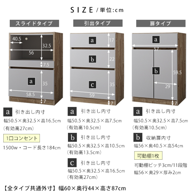| 商品重量 | 扉タイプ:(約)18kg スライドタイプ:(約)20kg 引出タイプ:(約)30kg |