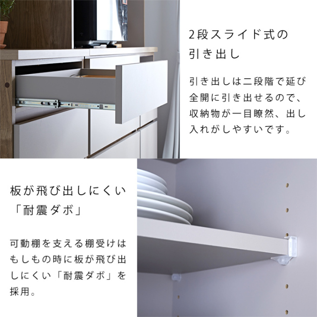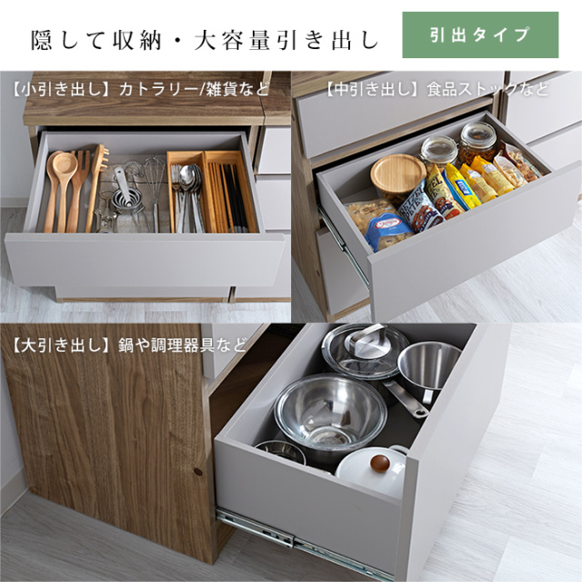 | 耐荷重 | 【扉タイプ】 天板:(約)30kg 引出:(約)10kg 可動棚:(約)3kg 【スライドタイプ】 天板:(約)30kg スライド棚:(約)10kg 引出:(約)10kg 【引出タイプ】 天板:(約)30kg 引出上:(約)10kg 引出中:(約)10kg 引出下:(約)10kg |