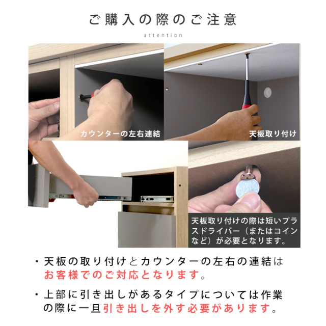 | 注意事項 | ※天板の取り付けは、お客様対応となります。 ※(カウンター2台を並べて設置する場合)左右の連結については、お客様対応となります。 |