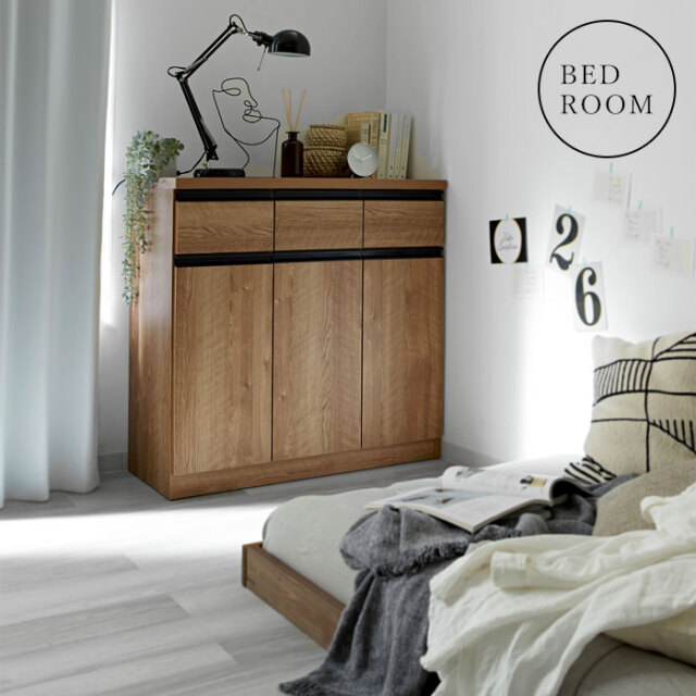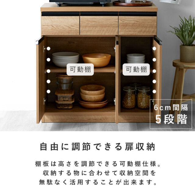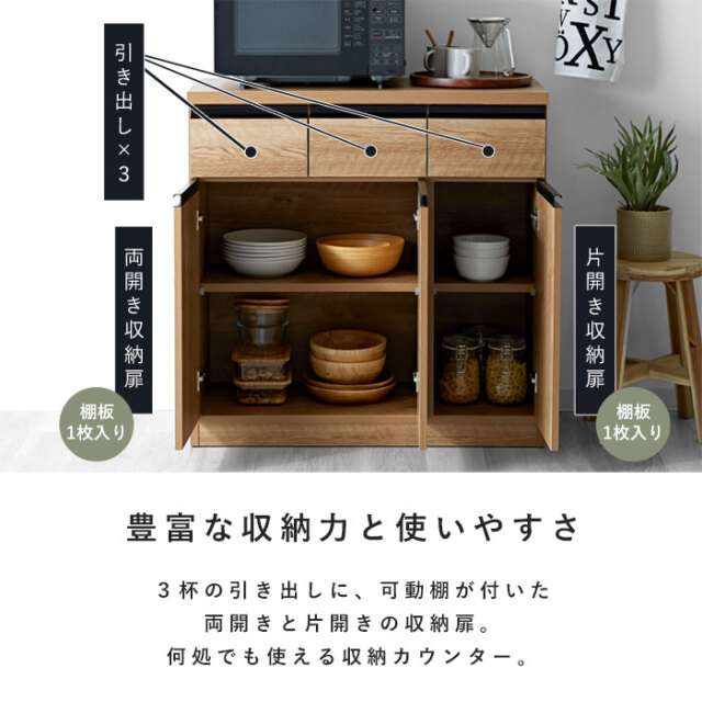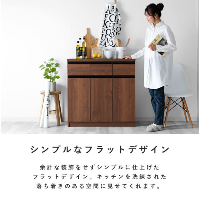 | シンプルなフラットデザイン 収納カウンター90 3枚扉 余計な装飾をせずシンプルに仕上げたフラットデザイン。 どんな場所でも美しく収納。「キッチン」や「リビング」を洗練された落ち着きのある空間に見せてくれます。 デザイン・機能・収納力全てが欲しい。 3杯の引き出しに、可動棚が付いた両開きと片開きの収納扉。機能や収納力はもちろん。お洒落さだって何一つ譲れない。そんなあなたにオススメしたい国産の収納カウンターができました。 完成した状態で届くので、届いたその日にすぐお使いいただけます。 熟練の家具職人が一つ一つ丁寧に真心こめて作り上げた完成度の高いキッチン収納。安価な輸入品とは違い、手作りのプライドと情熱が集結しています。 美しい木目模様のウッドとブラックの取っ手を組み合わせた雰囲気あるデザイン。北欧系やモダンなどどんなお部屋にも、清潔感のある空間を演出します。素敵になじむ人気の国産収納カウンター。 | |