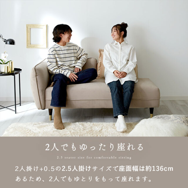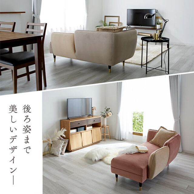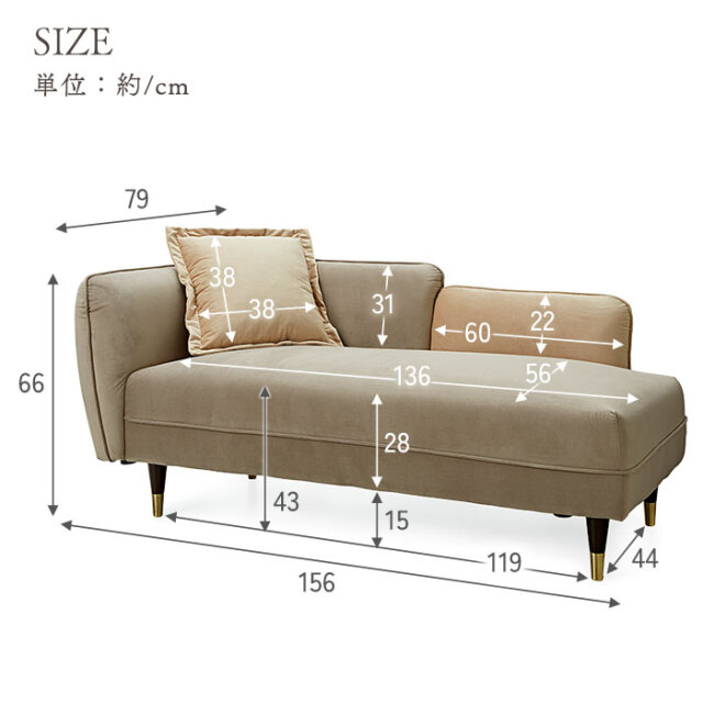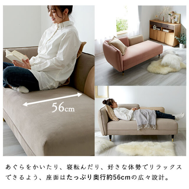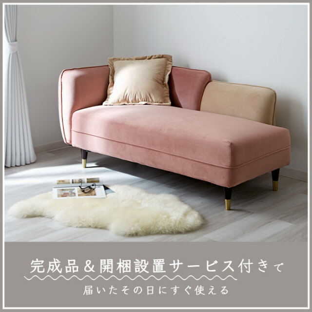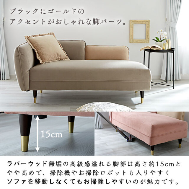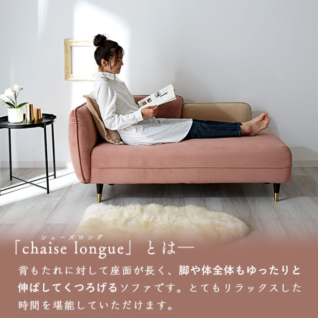 | ゴージャスだけど、ゆったり落ち着ける― 脚を伸ばしてくつろげる、おしゃれな2.5人掛けシェーズロングソファ。 見た目だけではなく肌触り・座り心地など、使用感の満足度が高いソファに仕上げました。 シェーズロングとは背もたれに対して座面が長く、脚や体全体もゆったりと伸ばしてくつろげるソファです。 あぐらをかいたり寝転んだり、好きな体勢でリラックスできるよう、座面はたっぷり奥行約56cmの広々設計。 ベルベット生地が醸し出す、高級感のある表情も魅力です。 細かな起毛が生み出す美しい光沢となめらかな肌触りが特徴で、他にない艶やかな高級感を演出してくれます。 届いたその日にすぐ使える完成品! 開梱設置サービス付きで後片付けまでお任せください。 お部屋に溶け込みながらもアクセントになるデザインがおしゃれ! 見た目だけじゃなく、座り心地にもこだわりました。 高級ソファに使用される内部構造を再現し、硬すぎず柔らかすぎない座り心地を追求。 2人掛け+0.5の2.5人掛けサイズで、座面幅は約136cmあるため、2人でもゆとりをもって座れます。 ブラックにゴールドのアクセントがおしゃれな脚パーツもポイントです。 ラバーウッド無垢の高級感溢れる脚部はやや高めに設定。 掃除機やお掃除ロボットも入りやすく、ソファを移動しなくてもお掃除しやすいのが魅力です。 お部屋を広く見せるロースタイルもおすすめです。 ネジ式で簡単着脱の脚パーツを外せばローソファに大変身。 おしゃれなクッションがひとつ付いていますので、 ソファでの過ごし方をより快適にしてくれます。 | |