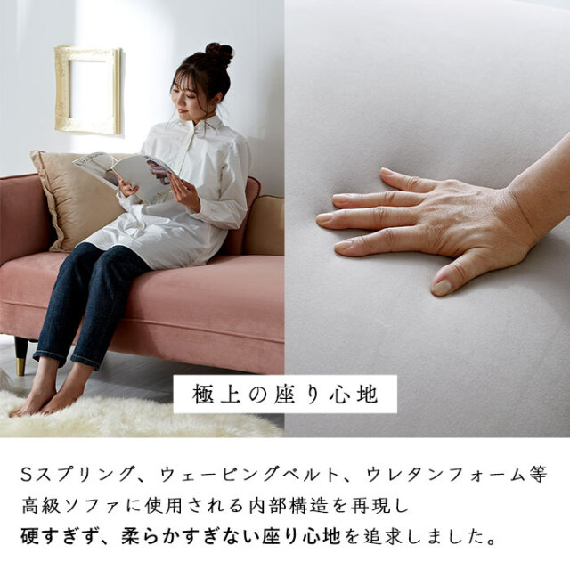 | 商品仕様 | 本体:ベルベット生地/FAB 脚:ラバーウッド無垢 中・芯:Sスプリング、シリコンフィル、ウレタンフォーム、ウェービングベルト |