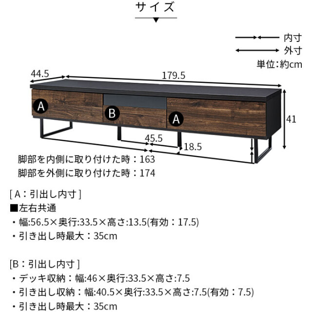 | 商品サイズ | (約)幅179.5cm×奥行44.5cm×高さ41cm |