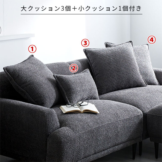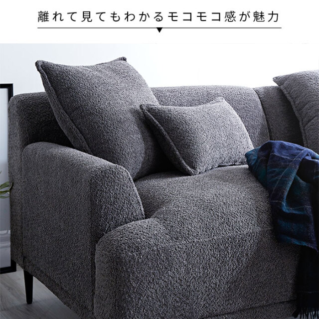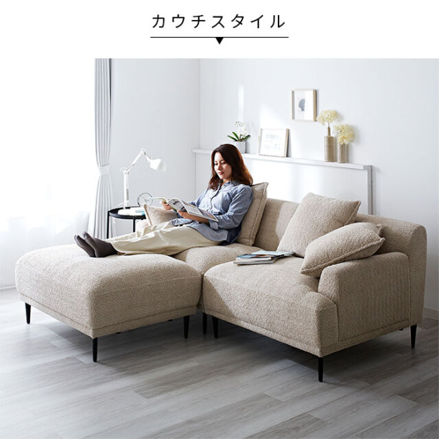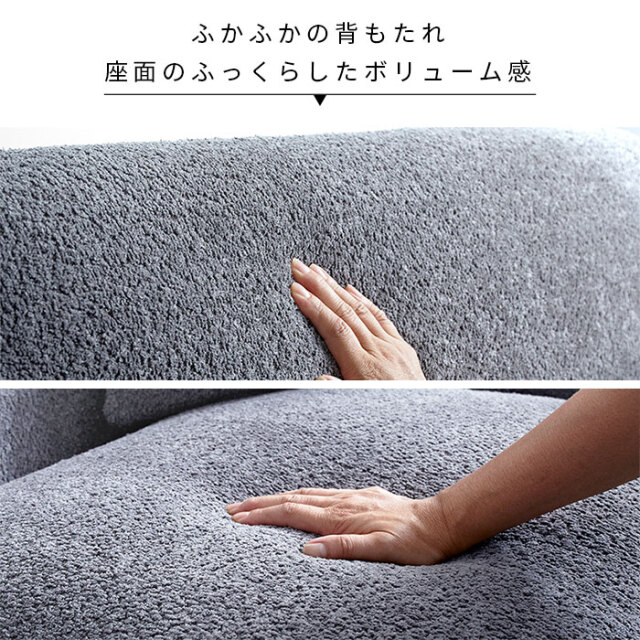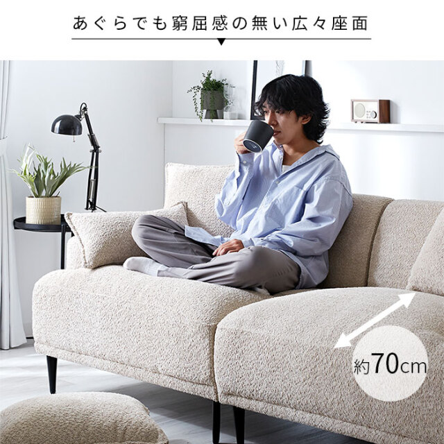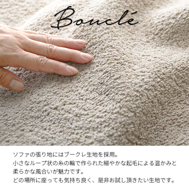 | 開放感にあふれる広々とした座面と自由自在のシートレイアウト。 それぞれのお部屋の事情に合わせてフィットするソファになります。 モコモコ肌触りで暖かみ溢れるソファ。 お部屋に置くだけでほっこりとした空間が広がります。 ソファの張り地にはブークレ生地を採用。 小さなループ状の糸の輪で作られた細やかな起毛による温かみと柔らかな風合いが魅力です。 どの場所に座っても気持ち良く、是非お試し頂きたい生地です。 | |