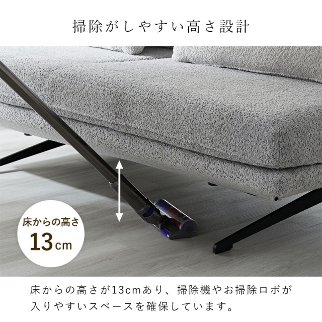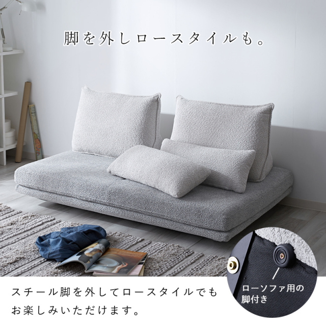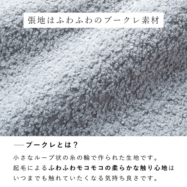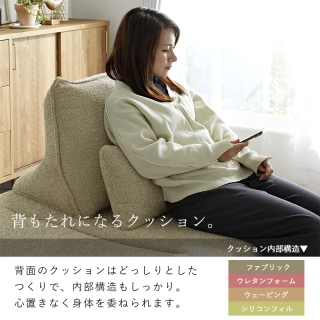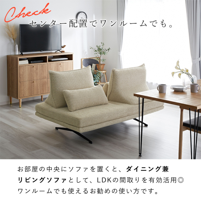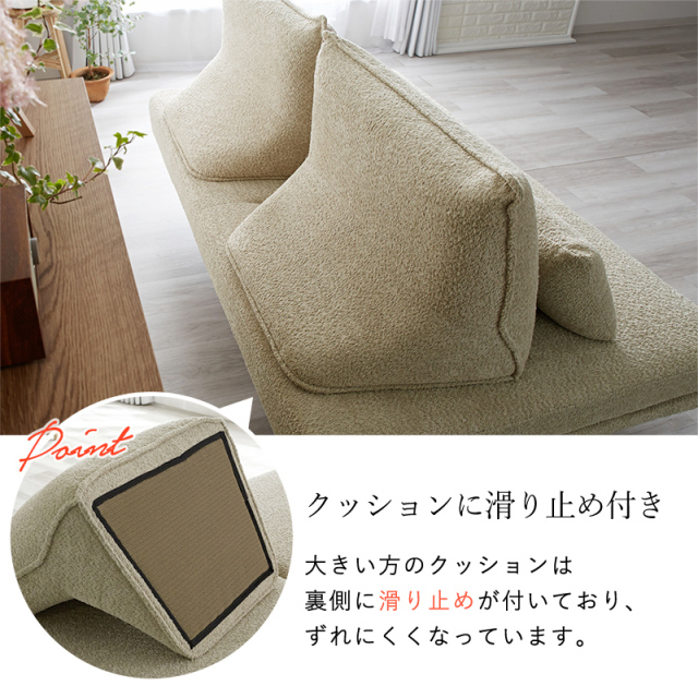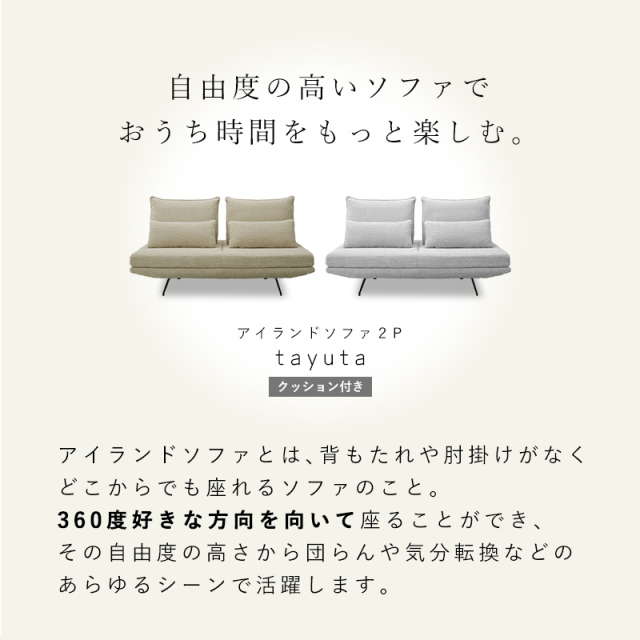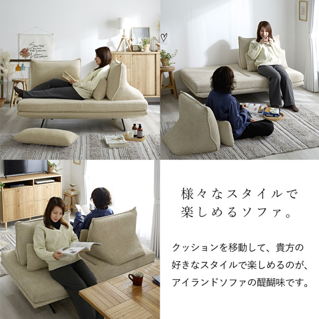 | 「自由度の高いソファでおうち時間をもっと楽しむ。」 アイランドソファとは、背もたれや肘掛けがなくどこからでも座れるソファのこと。 360度好きな方向を向いて座ることができ、その自由度の高さから団らんや気分転換などのあらゆるシーンで活躍。 クッションを移動して、貴方の好きなスタイルで楽しめるのが醍醐味です。 背面のクッションはどっしりとしたつくりで、内部構造もしっかり。 心置きなく身体を委ねられます。 また、クッション裏側に滑り止めが付いており、ずれにくいのもうれしいポイント。 張地はふわふわ、もこもこのブークレ生地。 小さなループ状の糸の輪で作られた生地で、起毛による柔らかな触り心地はいつまでも触れていたくなる気持ち良さです。 スチール素材のブラックカラーの脚が空間をぐっと引き締め、インテリアにメリハリを。 主張が少ない細めの脚なので、ナチュラルなテイストにもよく馴染みますよ。 | |