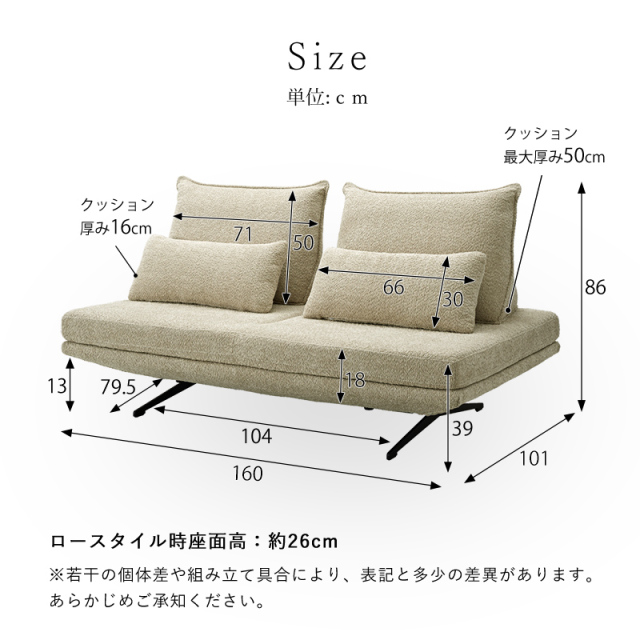 | 商品サイズ | 【本体】(約)幅160cm×奥行101cm×高さ39cm 【クッション】(約)幅71cm×奥行50cm×高さ50cm |
