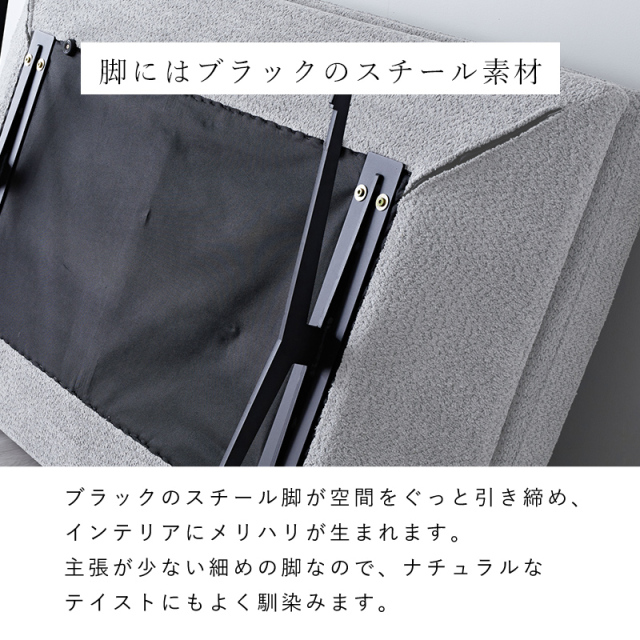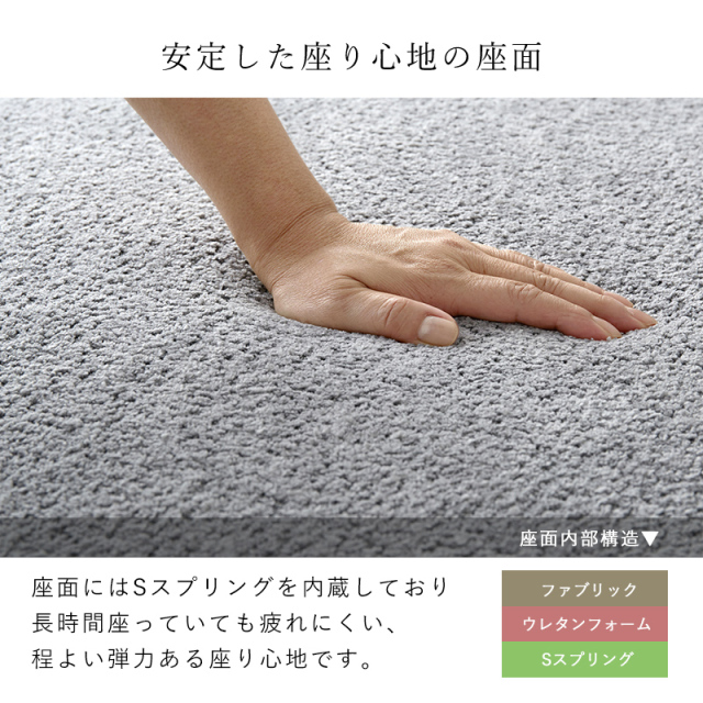 | 商品仕様 | 【本体】 張地:ブークレー生地 中材:ウレタンフォーム、Sバネ、ウェービングベルト 脚:スチール 【クッション】 張地:ブークレー生地 中材:ウレタンフォーム |