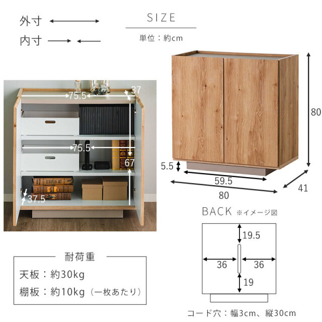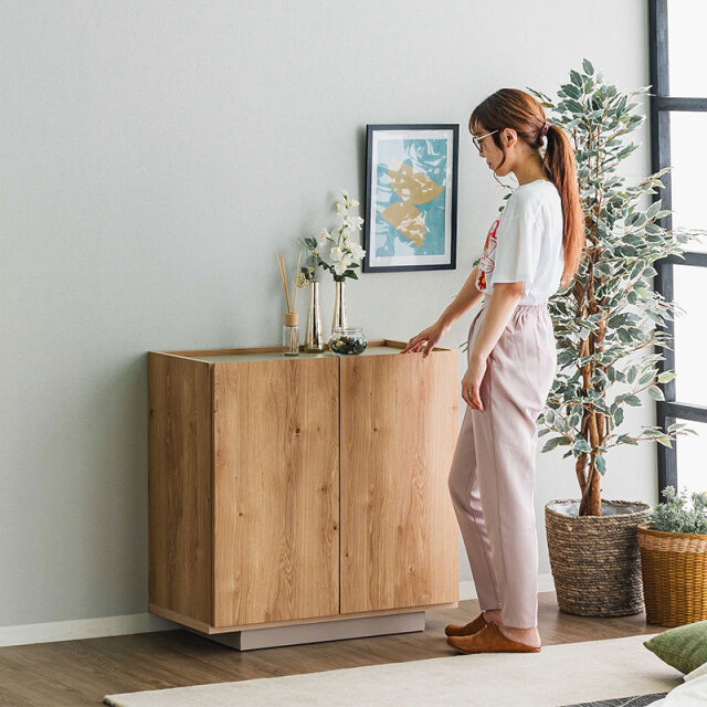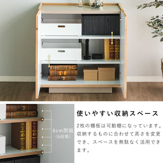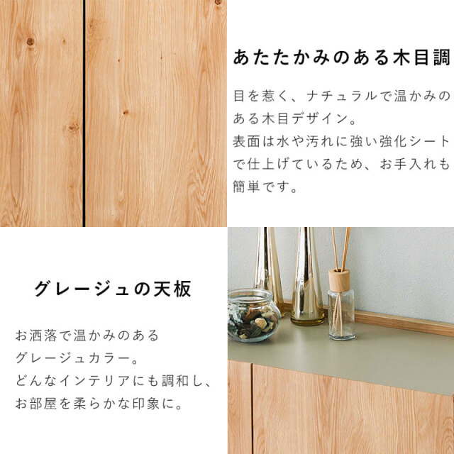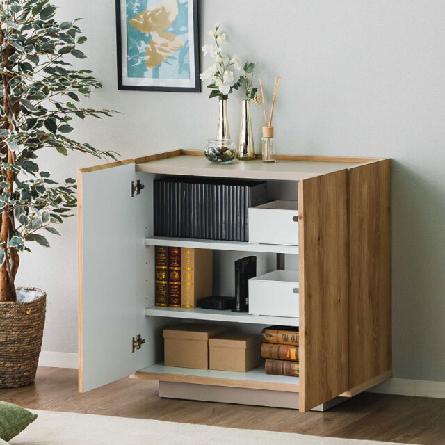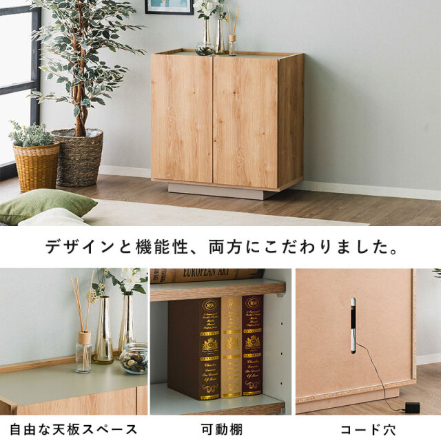 | 無駄のない美しさで、空間を整える。 リアルな木目調を再現したプリント強化紙のあたたかみと、天板にあしらったグレージュカラーが調和する、シンプルで洗練された北欧デザイン。 幅80cmのすっきりとした佇まいが、お部屋に自然と馴染む国産キャビネットです。 扉内には、6段階で高さ調整ができる可動棚を採用。 収納物の高さに合わせてご使用いただけます。。 背面にはコード穴付きで、ルーターや家電製品も配線を気にせずスマートに収納可能。 見た目も使い勝手も整う一台です。 暮らしにやさしく寄り添いながら、日々の「整える」を心地よくサポートします。 | |