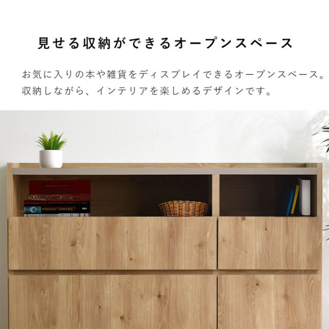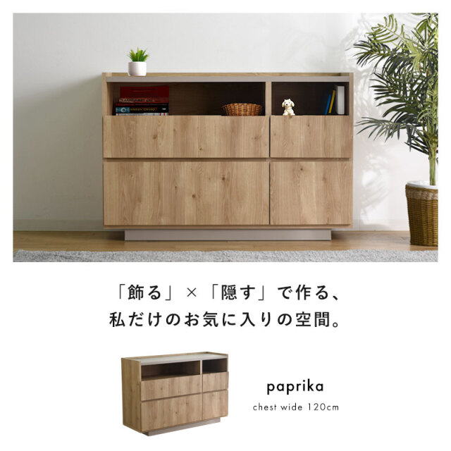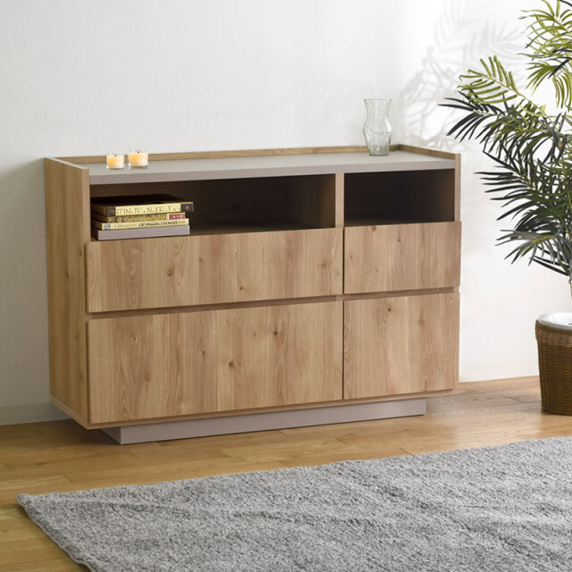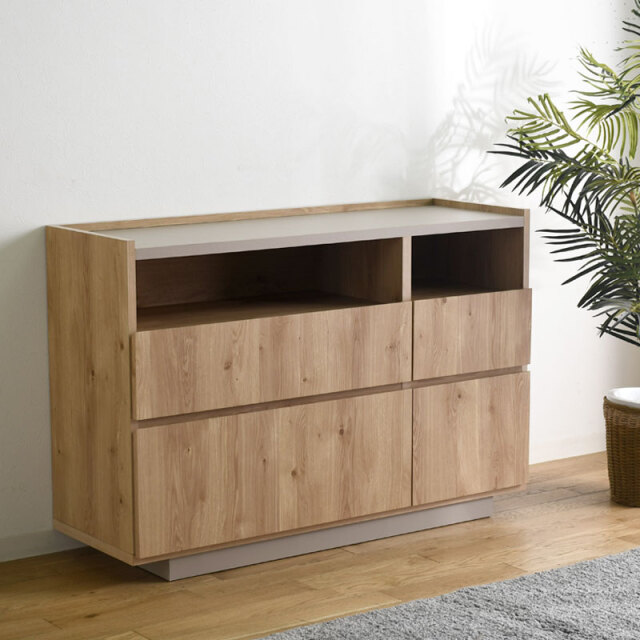 | 「飾る」×「隠す」でつくる、私だけのお気に入り空間。 リアルな木目を再現したプリント強化紙のあたたかみと、天板にあしらったグレージュカラーが調和する、シンプルで洗練された北欧デザイン。 幅120cmのすっきりとしたシルエットが、お部屋に自然と馴染む、国産のチェストです。 オープン収納には、お気に入りの雑貨や小物をディスプレイ。 引き出しには生活感の出やすいものをさっとしまって、見た目もすっきり。 「見せる」と「隠す」をバランスよく叶えて、空間を自分らしく整えられます。 | |