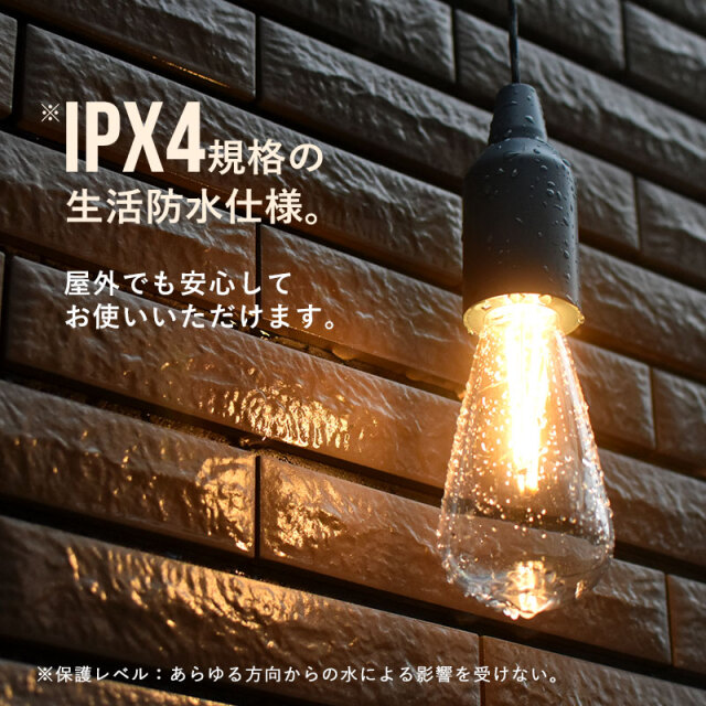 | 注意事項 | ・付属品のパーツを確認し、紛失しないように組み立ててください。・手順の通り正しく組み立ててからご使用ください。・火気のそばに置かないでください。変形や破損の原因になります。・電源のON/OFFを行う際は必ず片手で紐をもち、もう片方の手でソケット部分をもち紐を引っ張ってください。・長期間使用しない場合は電池を外して保管してください。・生活防水仕様のため水中での使用や直接水をかけるような使用はできません。・LEDライト本体とソケットが正しい位置で取付られていない場合、常時点灯したり点灯しない場合がございます。故障ではありませんのでもう一度正しく取付できているかご確認ください。LED:約50ルーメン(最大)連続点灯時間:約24h※連続点灯時間に応じて徐々に暗くなります。生活防水レベル:IPX4 |